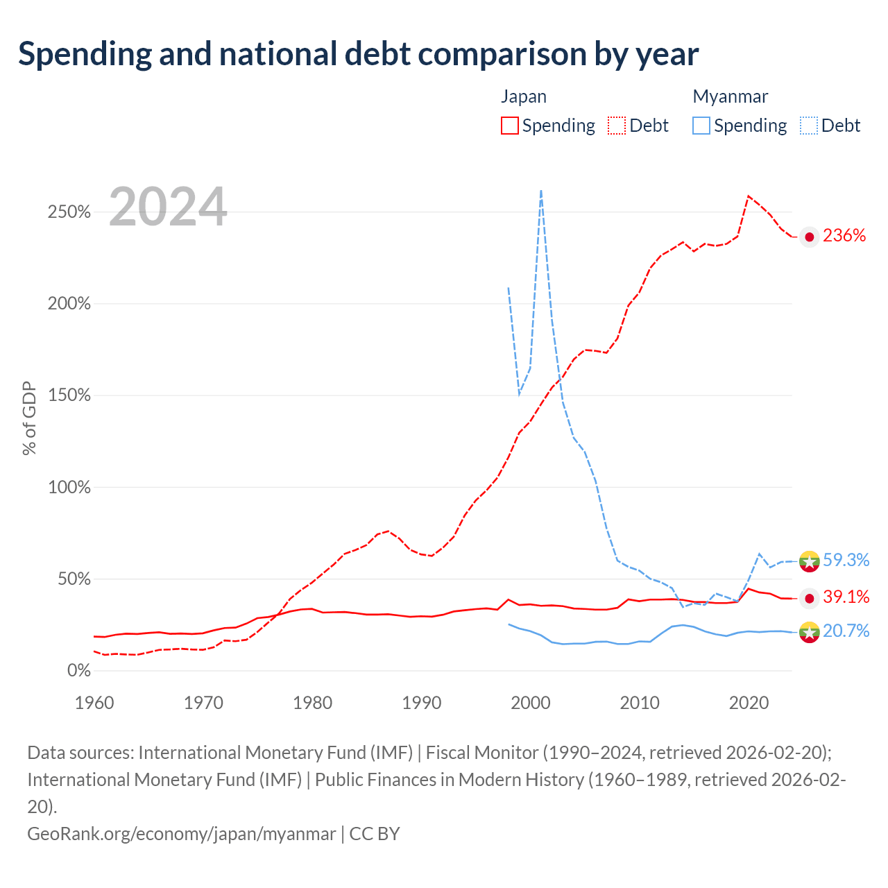 Japan has $9.51T in government debt (236.1% of GDP), compared to $44B (59.3% of GDP) in Myanmar.