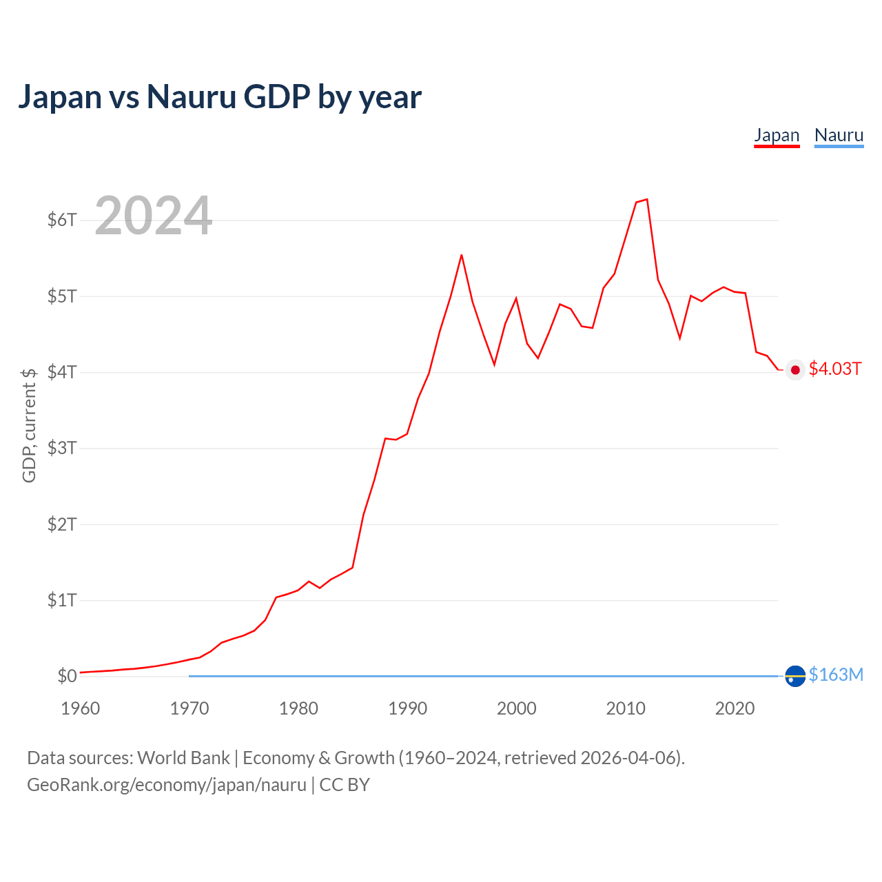 Japan has a GDP of $4.03T compared to $163M for Nauru, ranking 4/197 and 195/197 by economy size, respectively.
