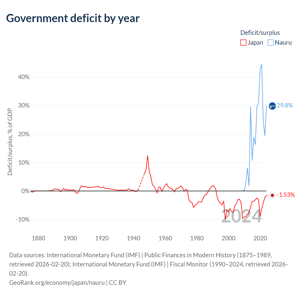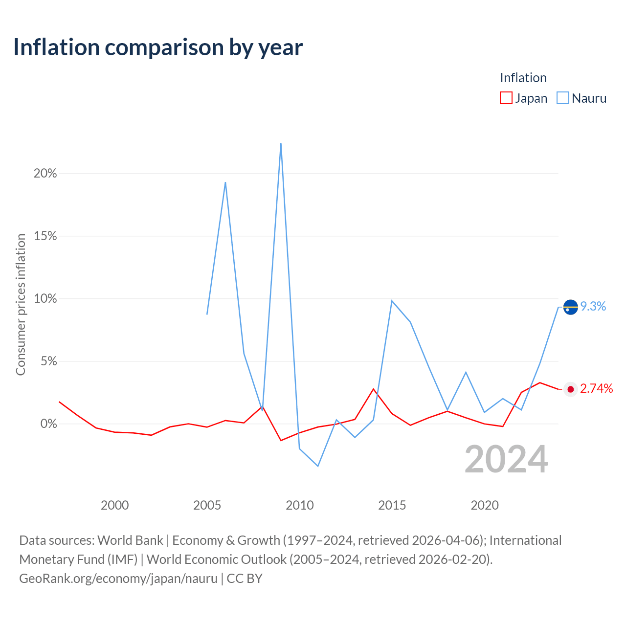 Over the past 20 years, Japan has recorded an average annual inflation rate of 0.65%, compared with 4.84% in Nauru. In 2024, inflation was 2.74% in Japan and 9.3% in Nauru.