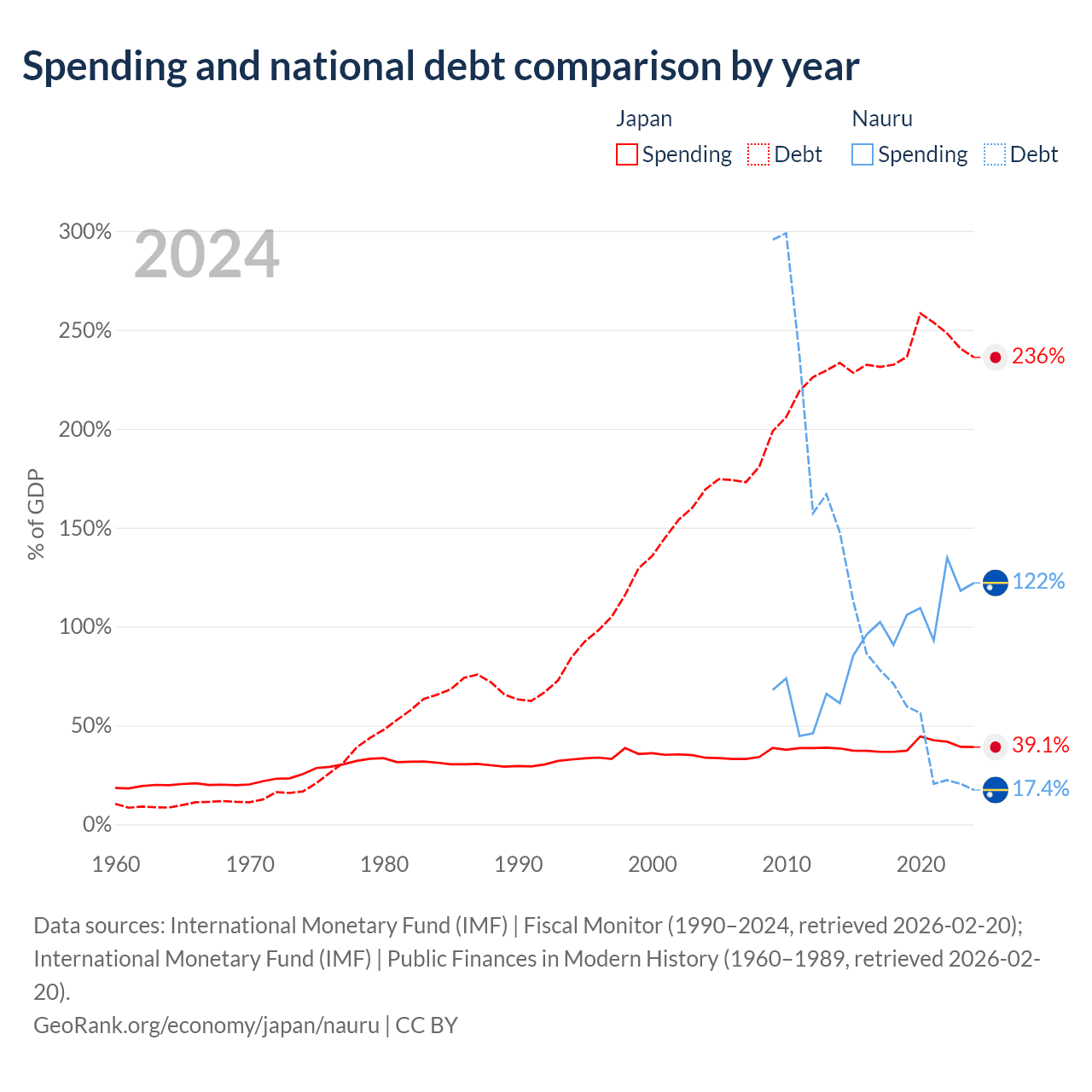 Japan has $9.51T in government debt (236.1% of GDP), compared to $28.3M (17.4% of GDP) in Nauru.