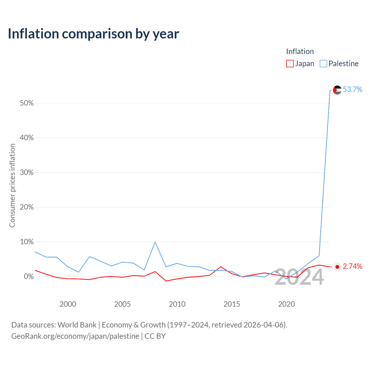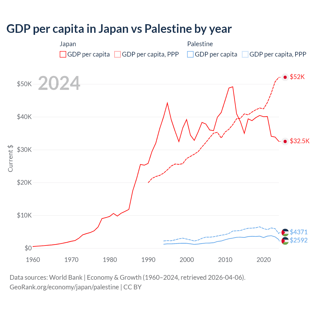 Japan has a GDP of $4.03T compared to $13.7B for Palestine, ranking 4/197 and 146/197 by economy size, respectively.