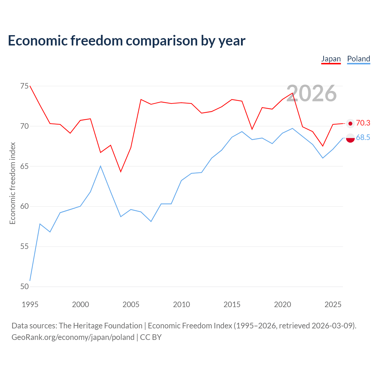 The Economic Freedom Index for Japan is 70.3, ranking 36/197, compared to 68.5 for Poland, ranking 46/197. The chart above displays a comparison of annual changes in economic freedom indexes.