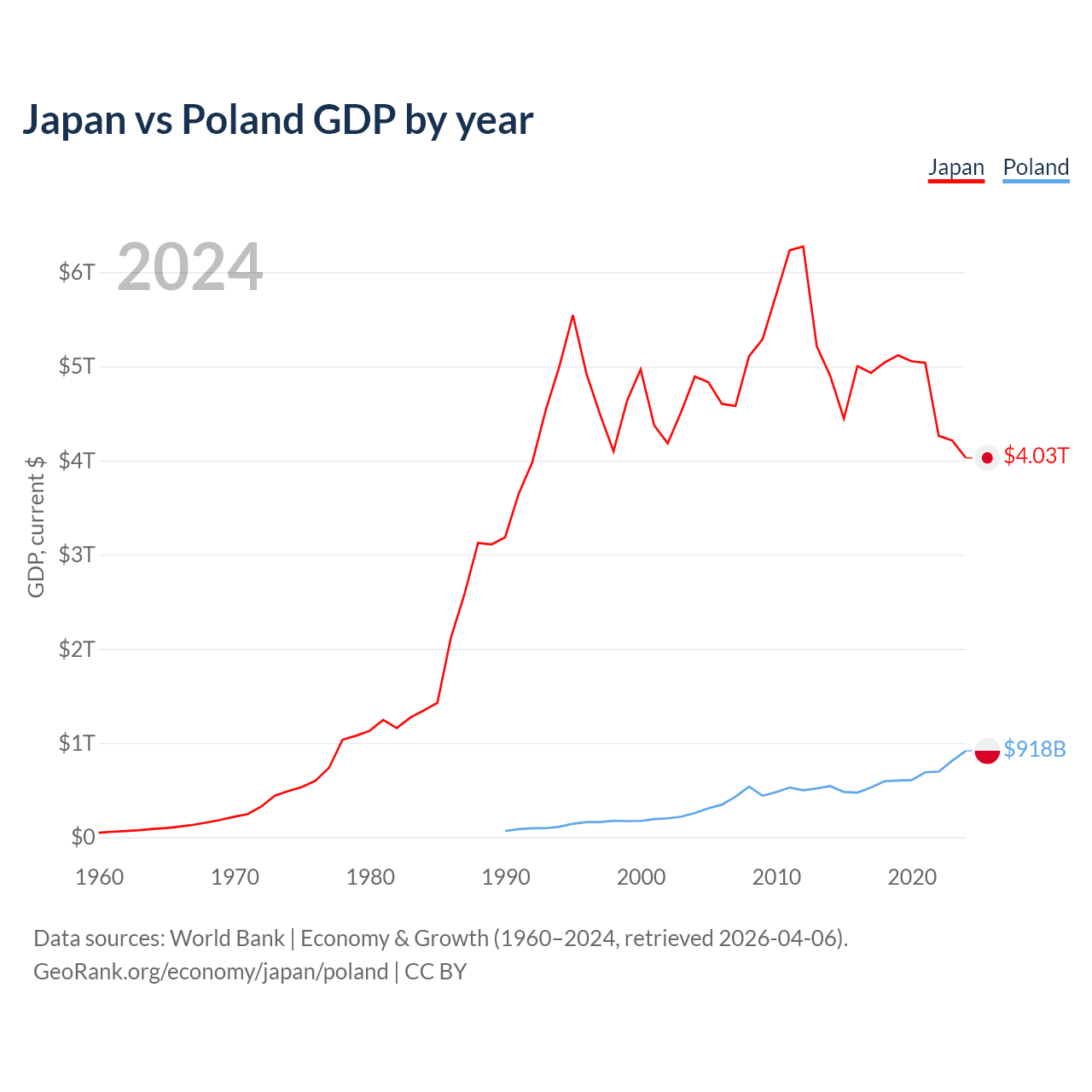 Japan has a GDP of $4.03T compared to $918B for Poland, ranking 4/197 and 21/197 by economy size, respectively.
