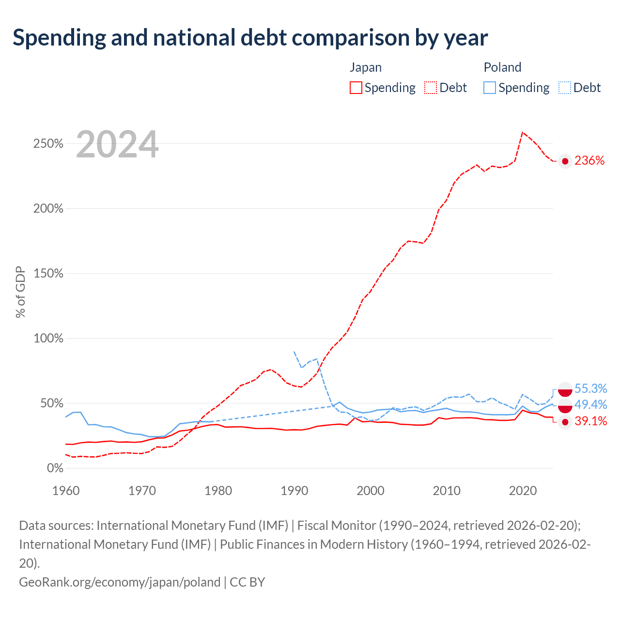 Japan has $9.51T in government debt (236.1% of GDP), compared to $507B (55.3% of GDP) in Poland.
