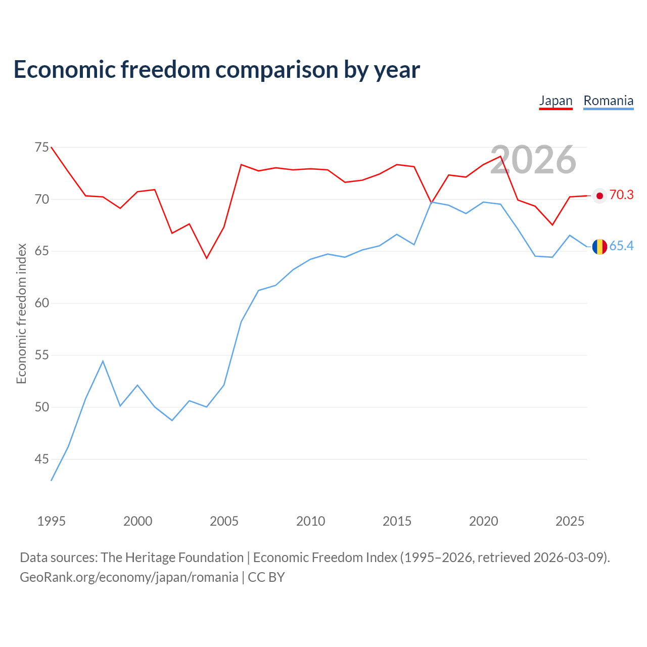 The Economic Freedom Index for Japan is 70.3, ranking 36/197, compared to 65.4 for Romania, ranking 64/197. The chart above displays a comparison of annual changes in economic freedom indexes.