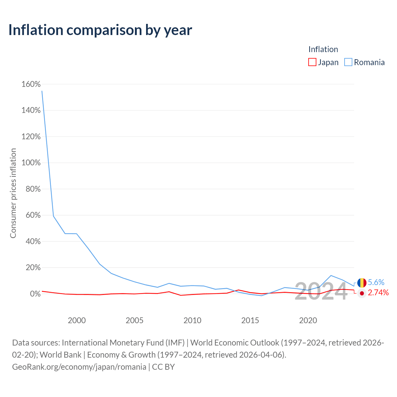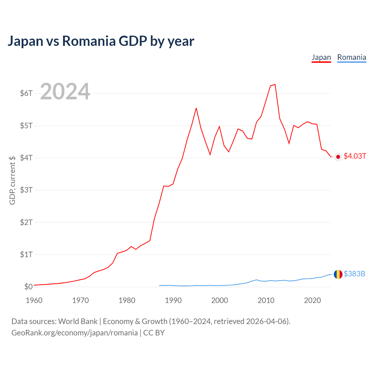 Japan has a GDP of $4.03T compared to $383B for Romania, ranking 4/197 and 42/197 by economy size, respectively.