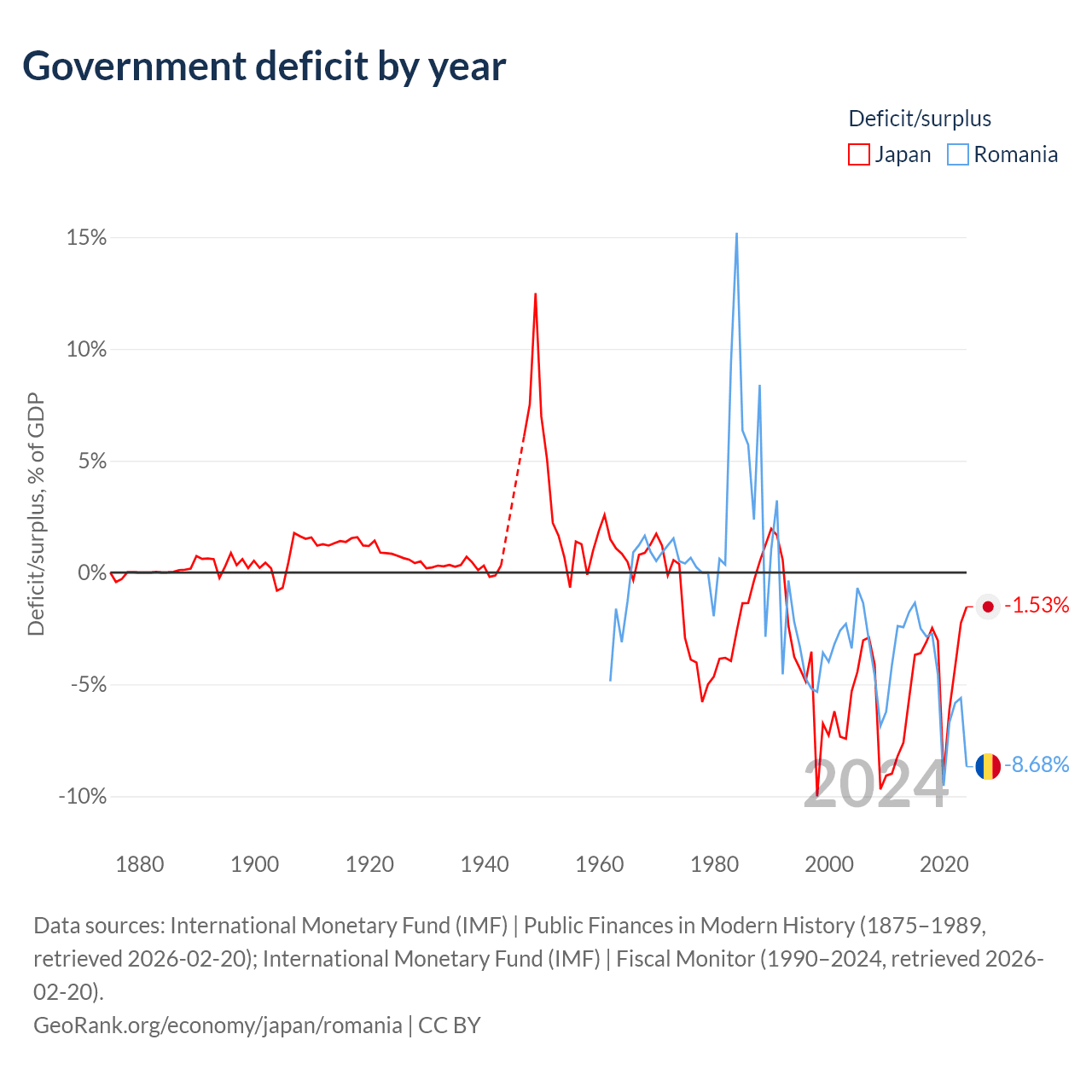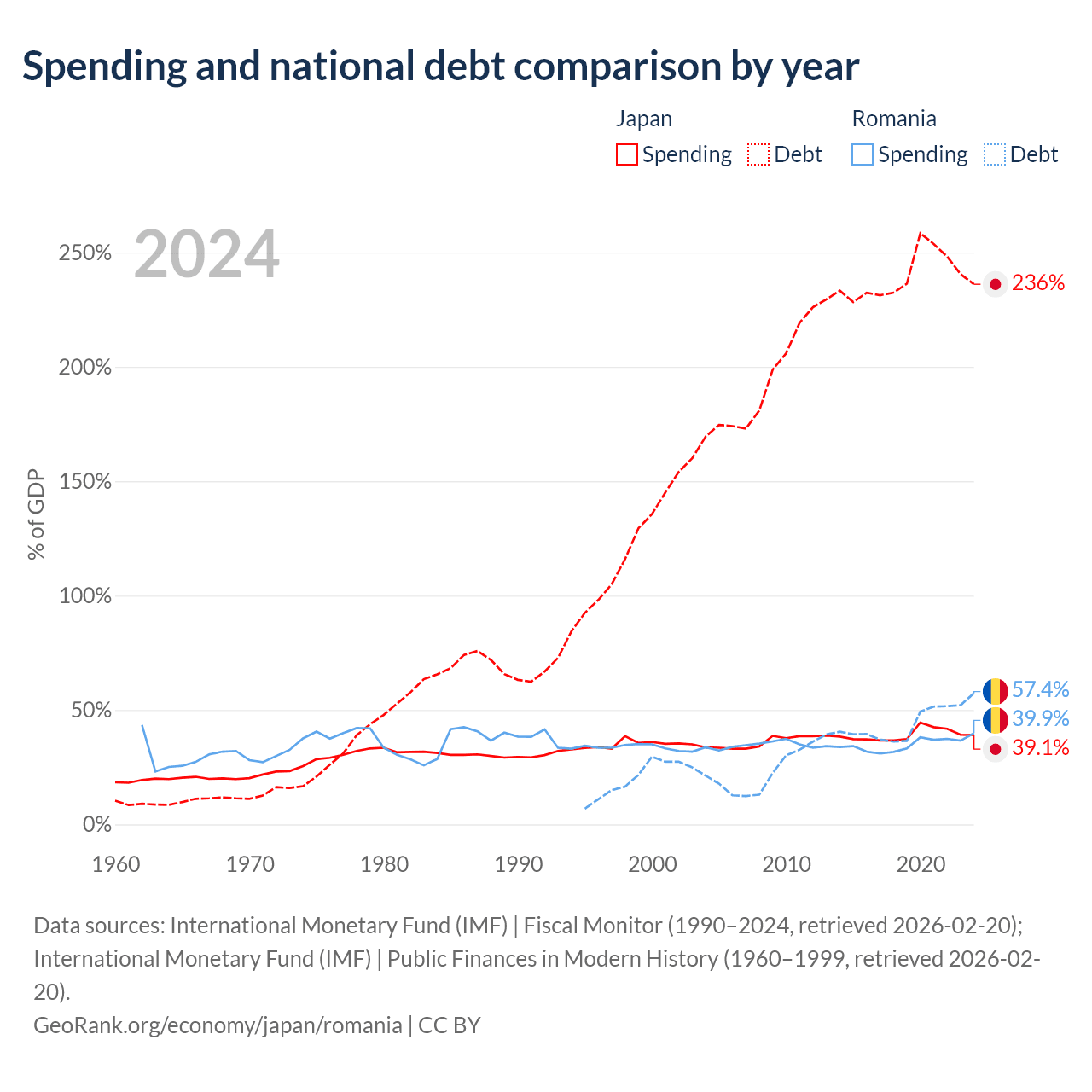 Japan has $9.51T in government debt (236.1% of GDP), compared to $220B (57.4% of GDP) in Romania.