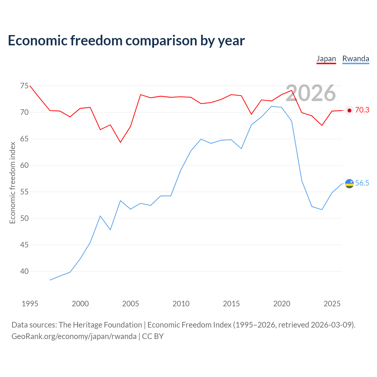 The Economic Freedom Index for Japan is 70.3, ranking 36/197, compared to 56.5 for Rwanda, ranking 121/197. The chart above displays a comparison of annual changes in economic freedom indexes.