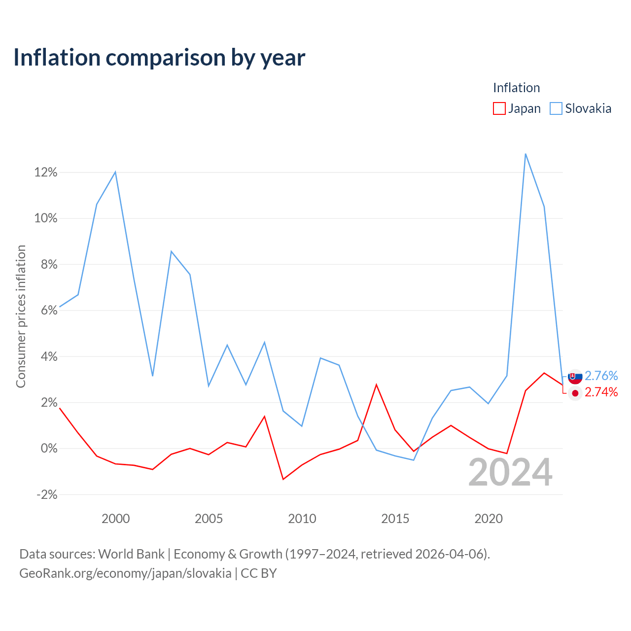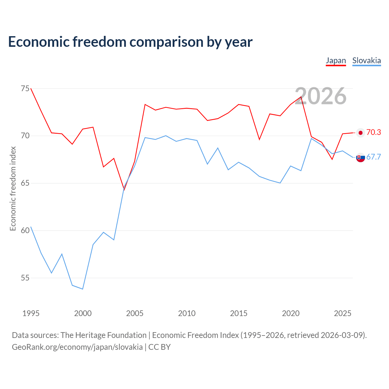The Economic Freedom Index for Japan is 70.3, ranking 36/197, compared to 67.7 for Slovakia, ranking 54/197. The chart above displays a comparison of annual changes in economic freedom indexes.