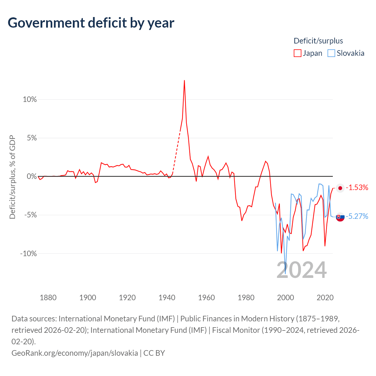 Japan has $9.51T in government debt (236.1% of GDP), compared to $80.7B (57.2% of GDP) in Slovakia.