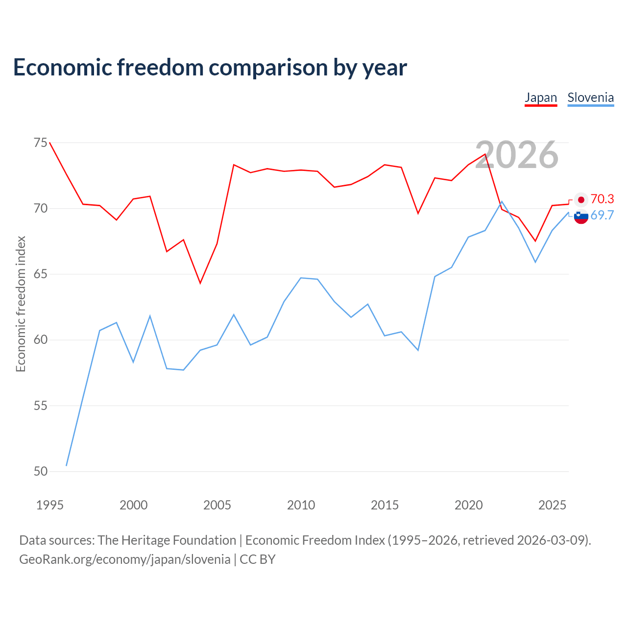 The Economic Freedom Index for Japan is 70.3, ranking 36/197, compared to 69.7 for Slovenia, ranking 40/197. The chart above displays a comparison of annual changes in economic freedom indexes.