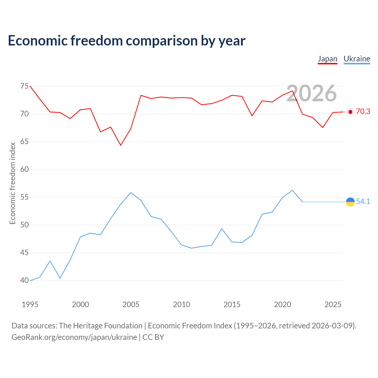 The Economic Freedom Index for Japan is 70.3, ranking 36/197, compared to 54.1 for Ukraine, ranking 135/197. The chart above displays a comparison of annual changes in economic freedom indexes.