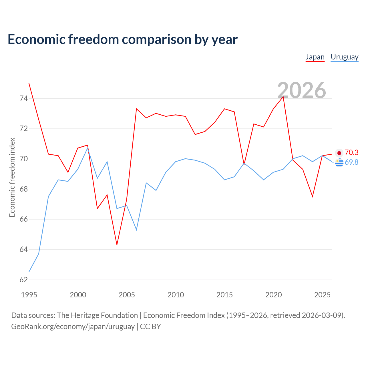 The Economic Freedom Index for Japan is 70.3, ranking 36/197, compared to 69.8 for Uruguay, ranking 39/197. The chart above displays a comparison of annual changes in economic freedom indexes.