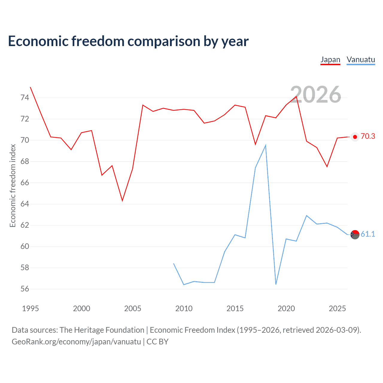 The Economic Freedom Index for Japan is 70.3, ranking 36/197, compared to 61.1 for Vanuatu, ranking 92/197. The chart above displays a comparison of annual changes in economic freedom indexes.