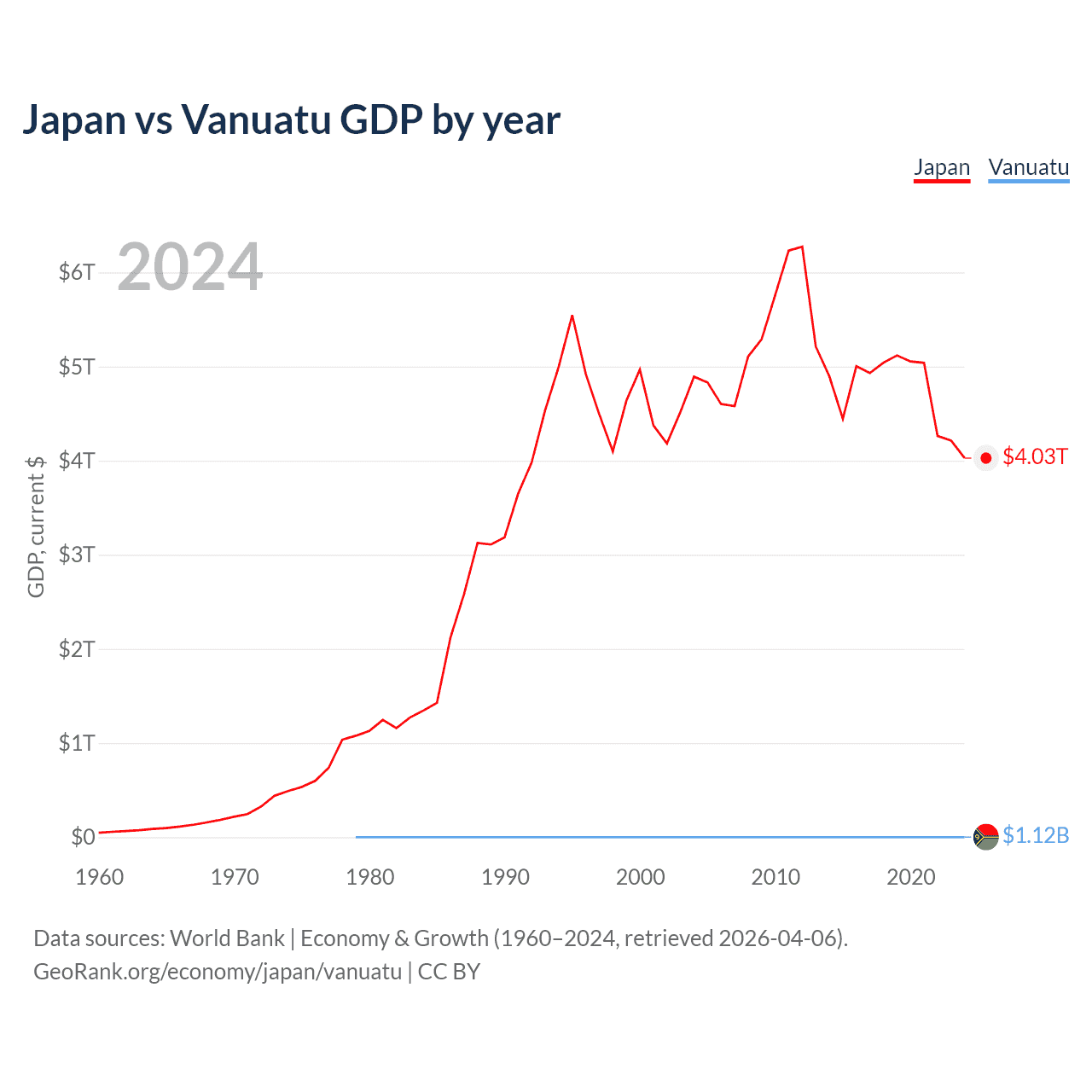 Japan has a GDP of $4.03T compared to $1.12B for Vanuatu, ranking 4/197 and 188/197 by economy size, respectively.