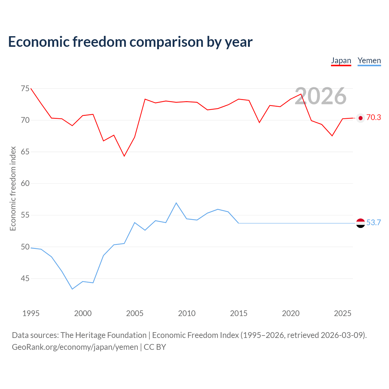 The Economic Freedom Index for Japan is 70.3, ranking 36/197, compared to 53.7 for Yemen, ranking 138/197. The chart above displays a comparison of annual changes in economic freedom indexes.