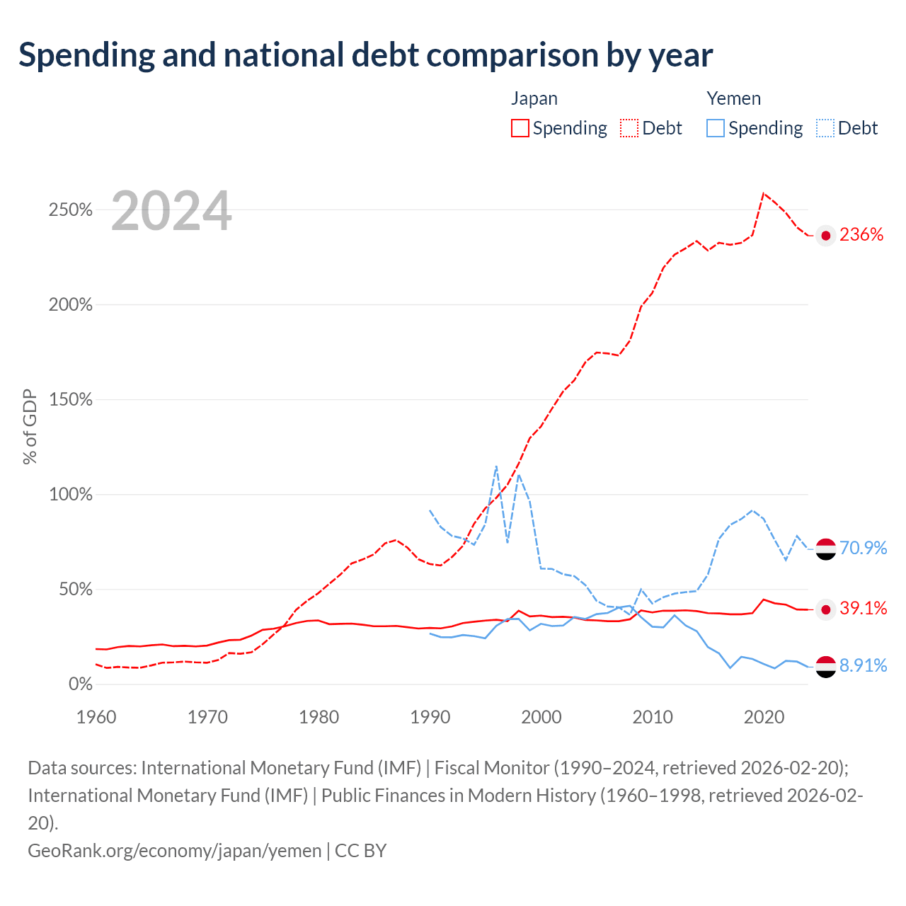 Japan has $9.51T in government debt (236.1% of GDP), compared to $18.8B (70.9% of GDP) in Yemen.