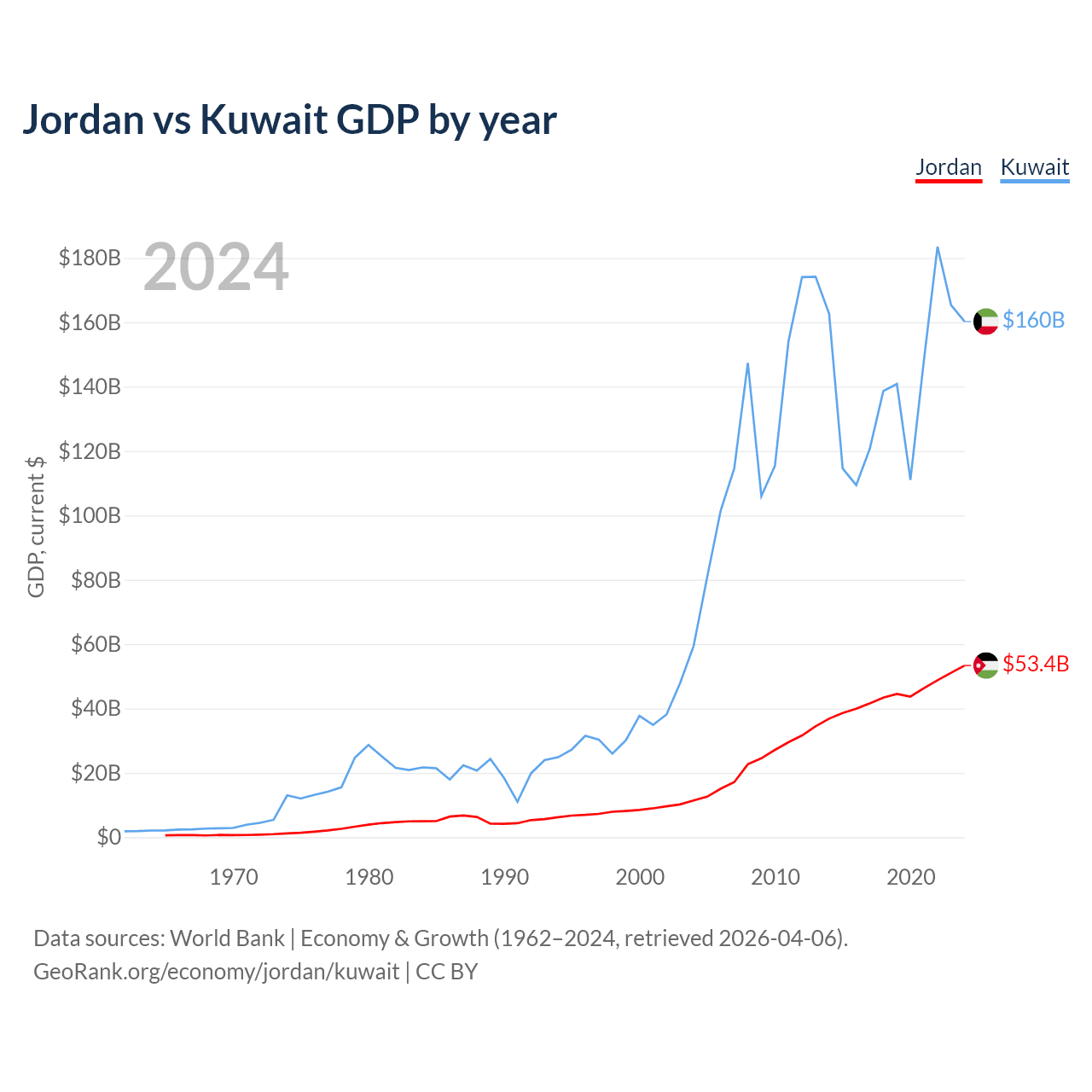 Jordan has a GDP of $53.4B compared to $160B for Kuwait, ranking 90/197 and 59/197 by economy size, respectively.