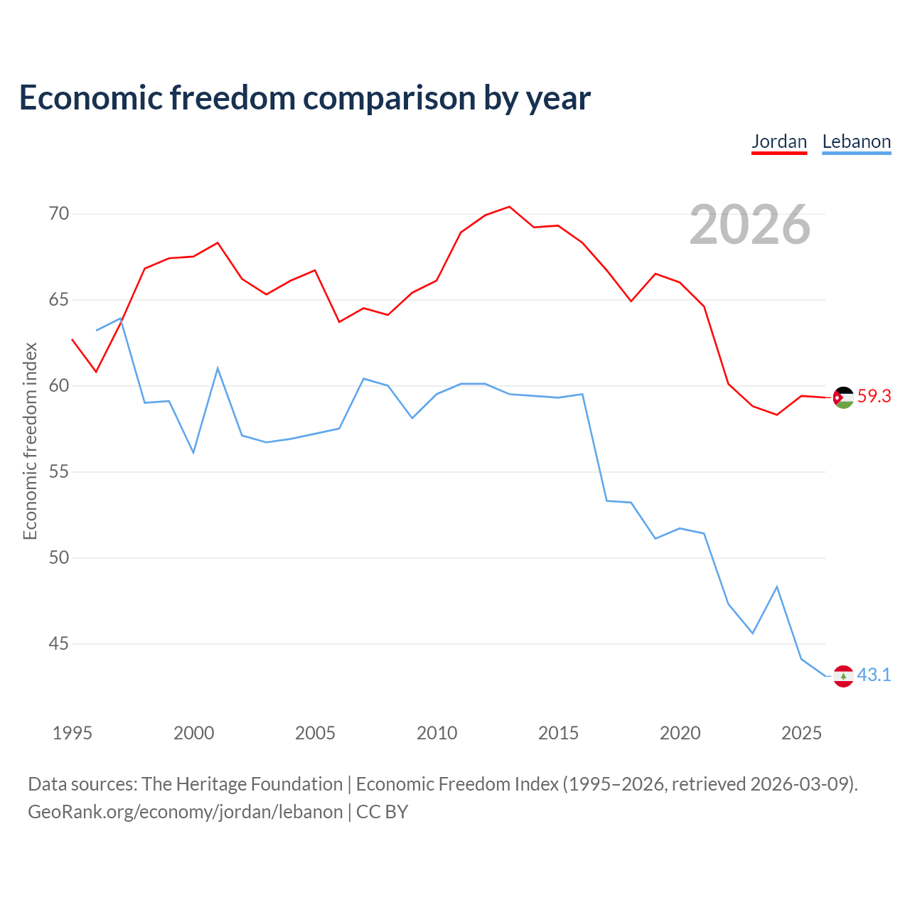 The Economic Freedom Index for Jordan is 59.3, ranking 104/197, compared to 43.1 for Lebanon, ranking 183/197. The chart above displays a comparison of annual changes in economic freedom indexes.