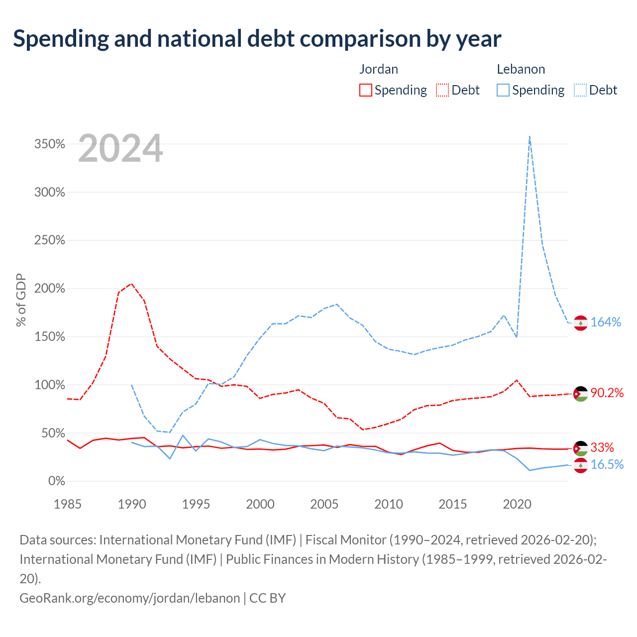 Jordan has $48.1B in government debt (90.2% of GDP), compared to $38.7B (163.8% of GDP) in Lebanon.