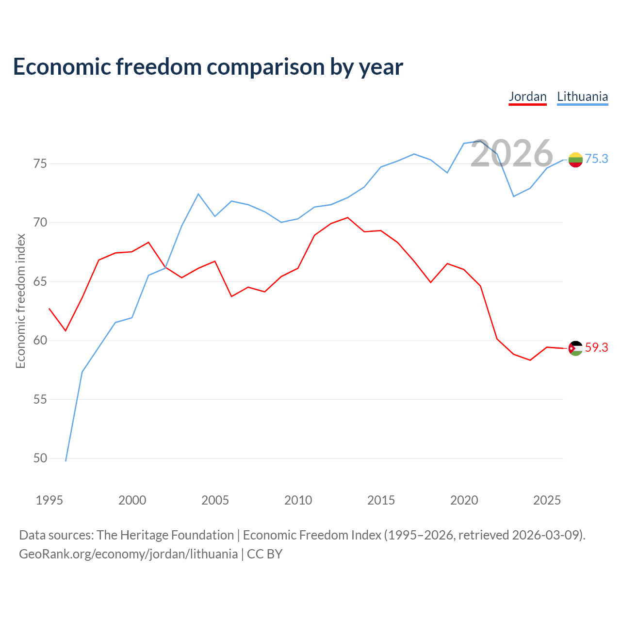 The Economic Freedom Index for Jordan is 59.3, ranking 104/197, compared to 75.3 for Lithuania, ranking 18/197. The chart above displays a comparison of annual changes in economic freedom indexes.