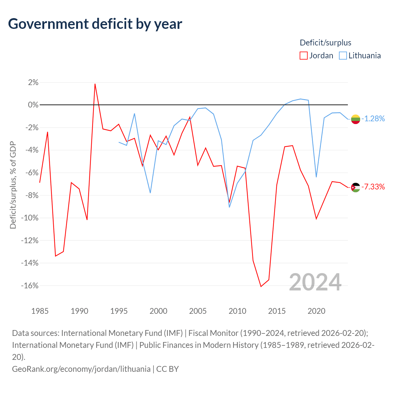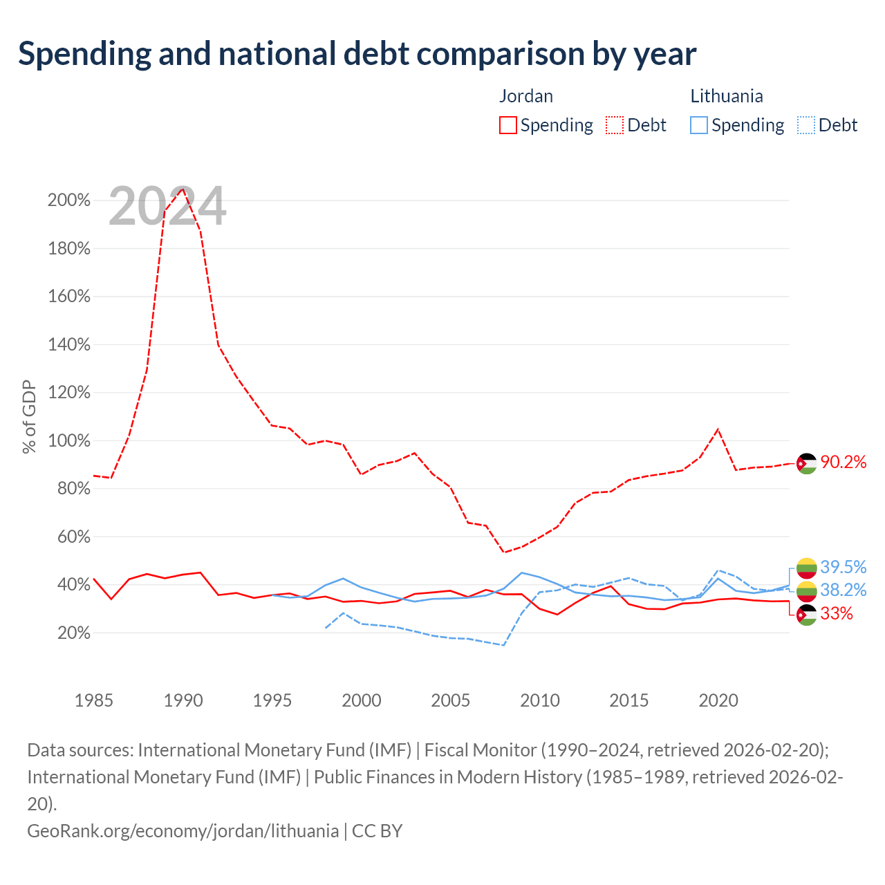 Jordan has $48.1B in government debt (90.2% of GDP), compared to $32.4B (38.2% of GDP) in Lithuania.