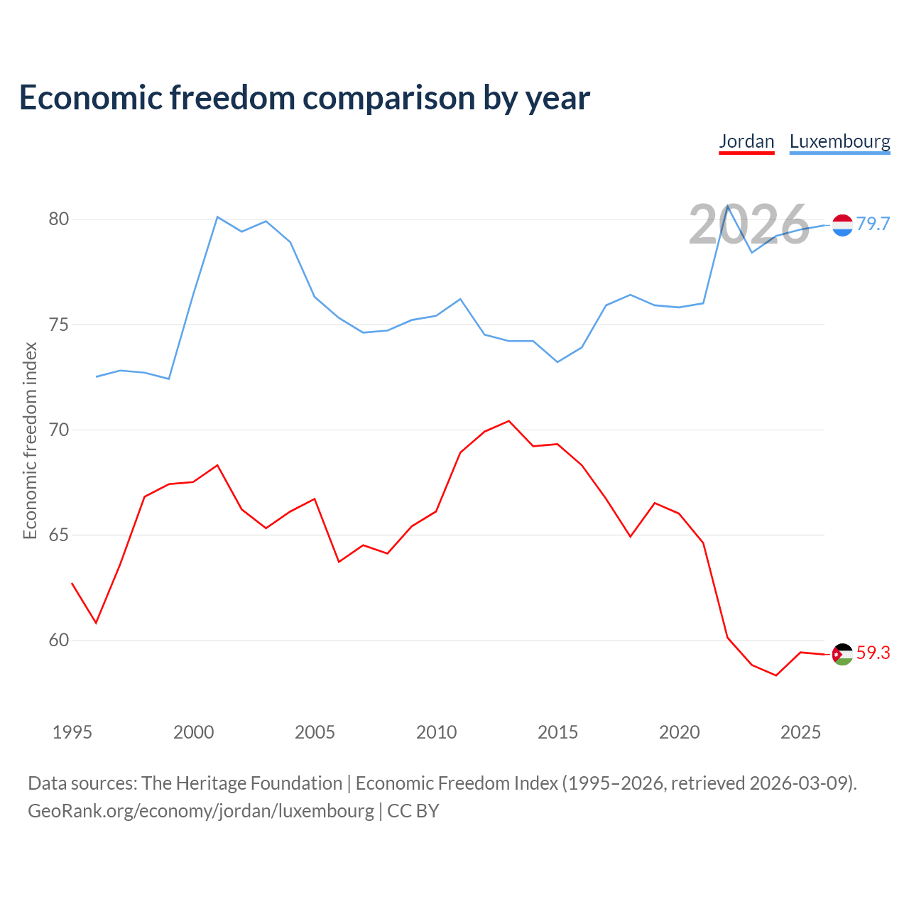 The Economic Freedom Index for Jordan is 59.3, ranking 104/197, compared to 79.7 for Luxembourg, ranking 7/197. The chart above displays a comparison of annual changes in economic freedom indexes.