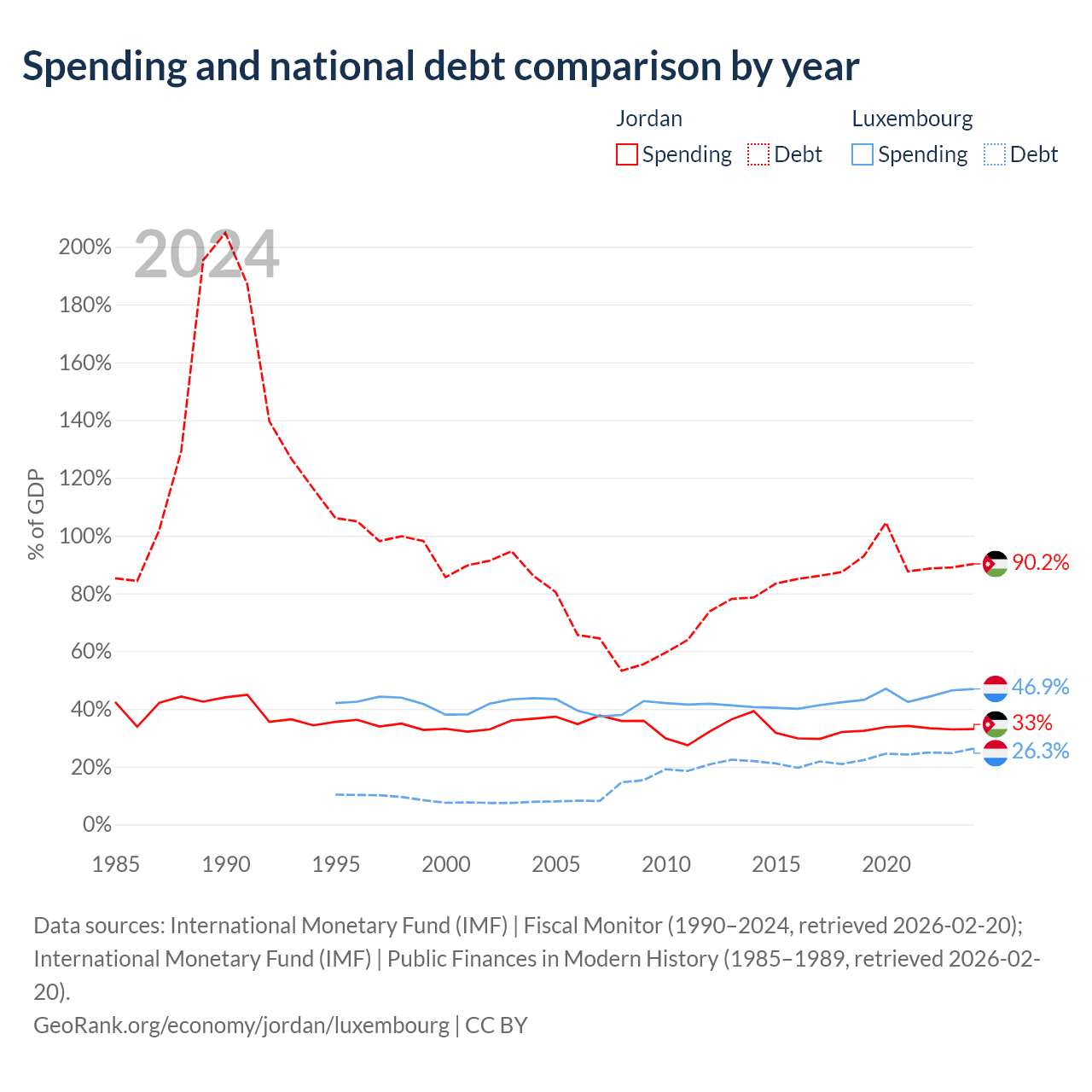 Jordan has $48.1B in government debt (90.2% of GDP), compared to $24.5B (26.3% of GDP) in Luxembourg.