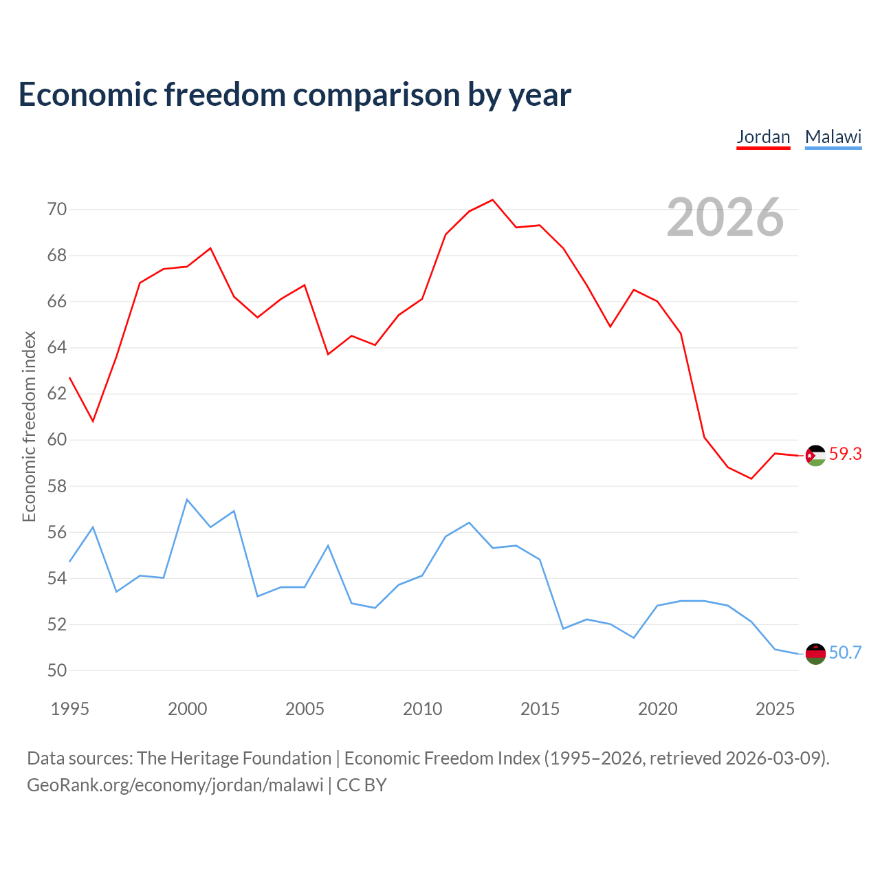 The Economic Freedom Index for Jordan is 59.3, ranking 104/197, compared to 50.7 for Malawi, ranking 159/197. The chart above displays a comparison of annual changes in economic freedom indexes.