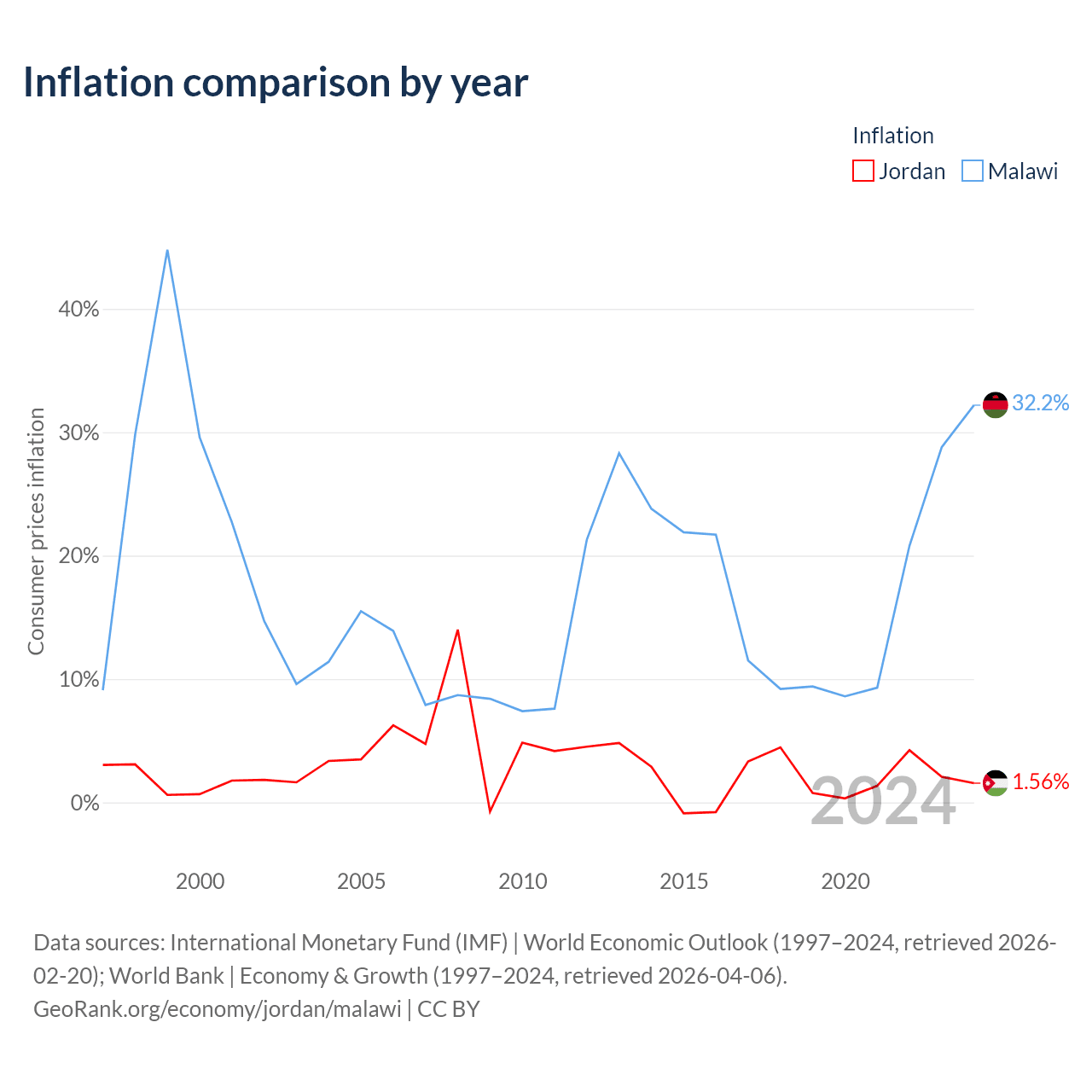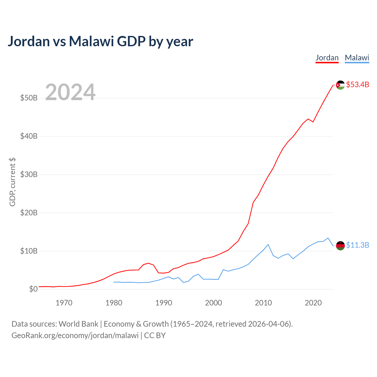 Jordan has a GDP of $53.4B compared to $11.3B for Malawi, ranking 90/197 and 151/197 by economy size, respectively.