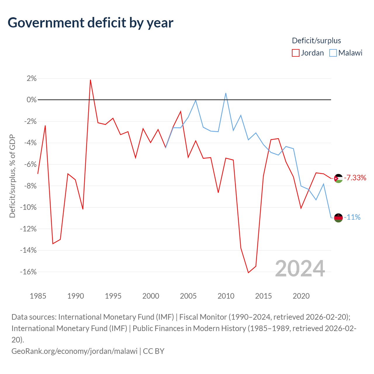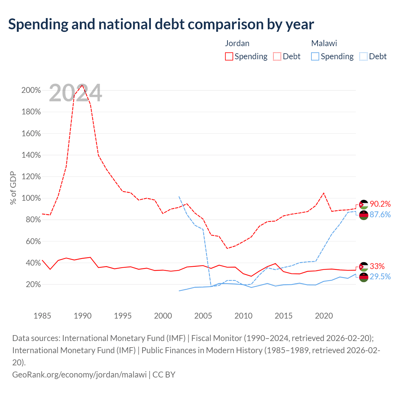 Jordan has $48.1B in government debt (90.2% of GDP), compared to $9.91B (87.6% of GDP) in Malawi.