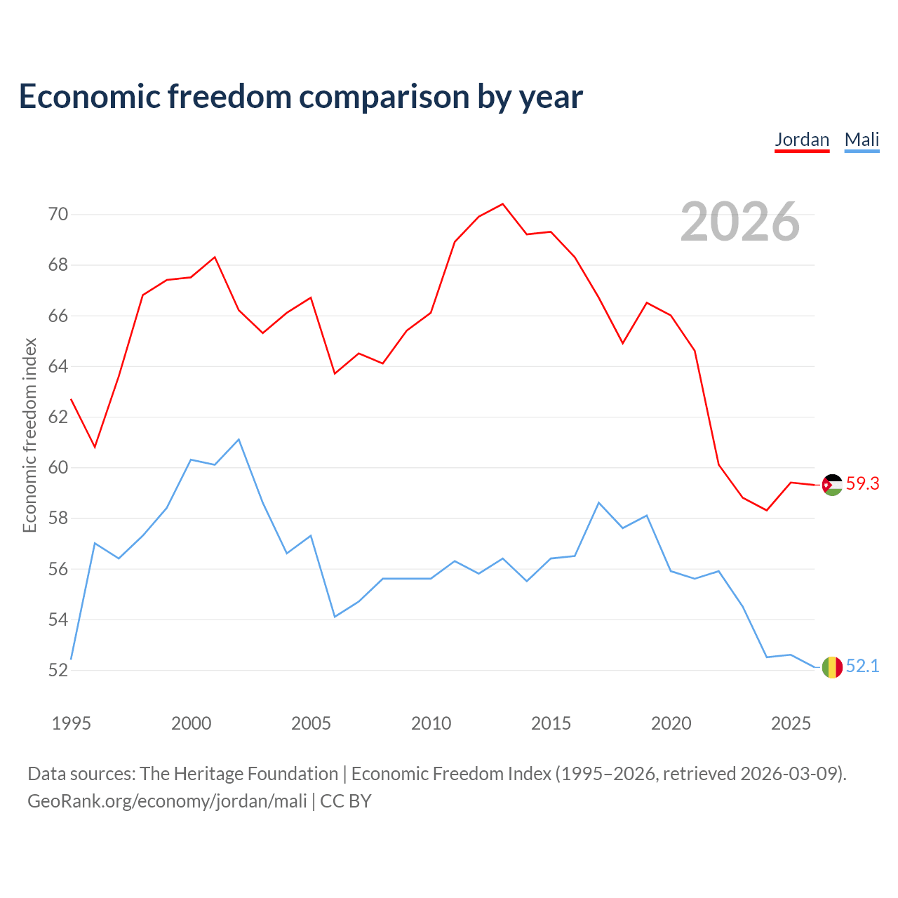 The Economic Freedom Index for Jordan is 59.3, ranking 104/197, compared to 52.1 for Mali, ranking 150/197. The chart above displays a comparison of annual changes in economic freedom indexes.