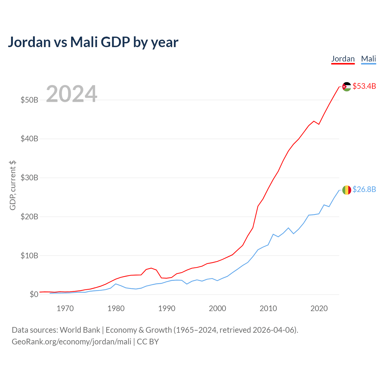 Jordan has a GDP of $53.4B compared to $26.8B for Mali, ranking 90/197 and 113/197 by economy size, respectively.