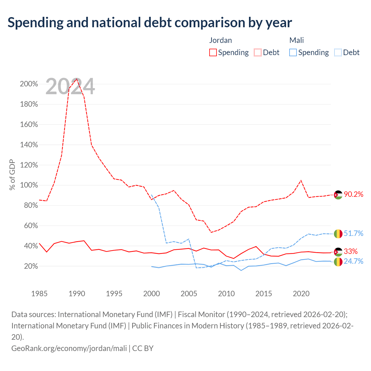 Jordan has $48.1B in government debt (90.2% of GDP), compared to $13.9B (51.7% of GDP) in Mali.