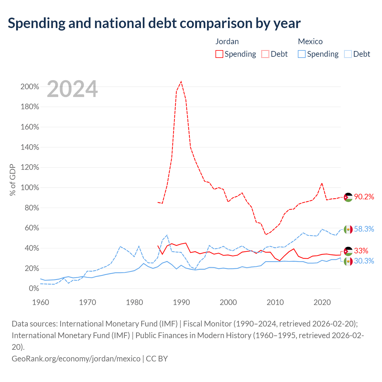 Jordan has $48.1B in government debt (90.2% of GDP), compared to $1.08T (58.3% of GDP) in Mexico.