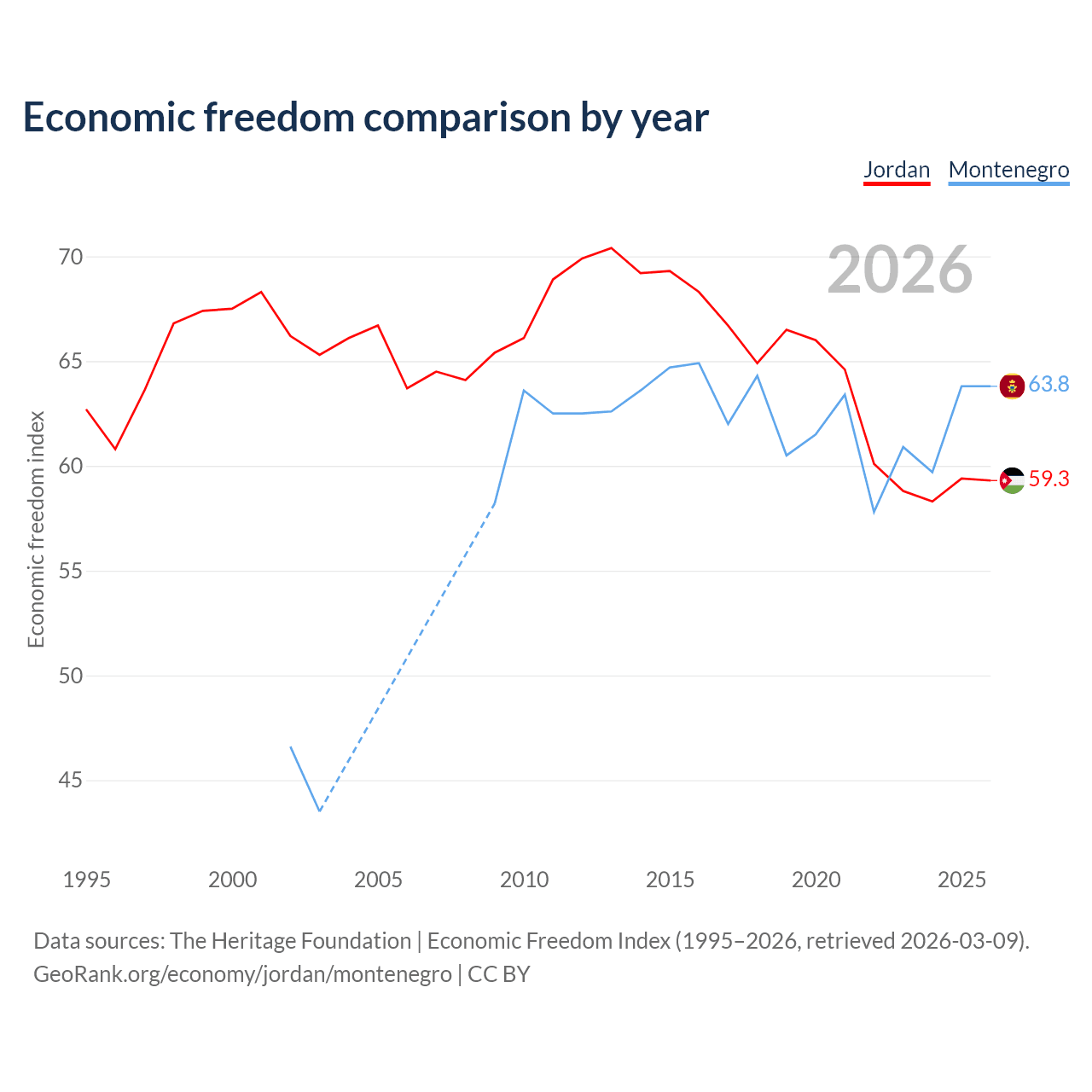 The Economic Freedom Index for Jordan is 59.3, ranking 104/197, compared to 63.8 for Montenegro, ranking 78/197. The chart above displays a comparison of annual changes in economic freedom indexes.