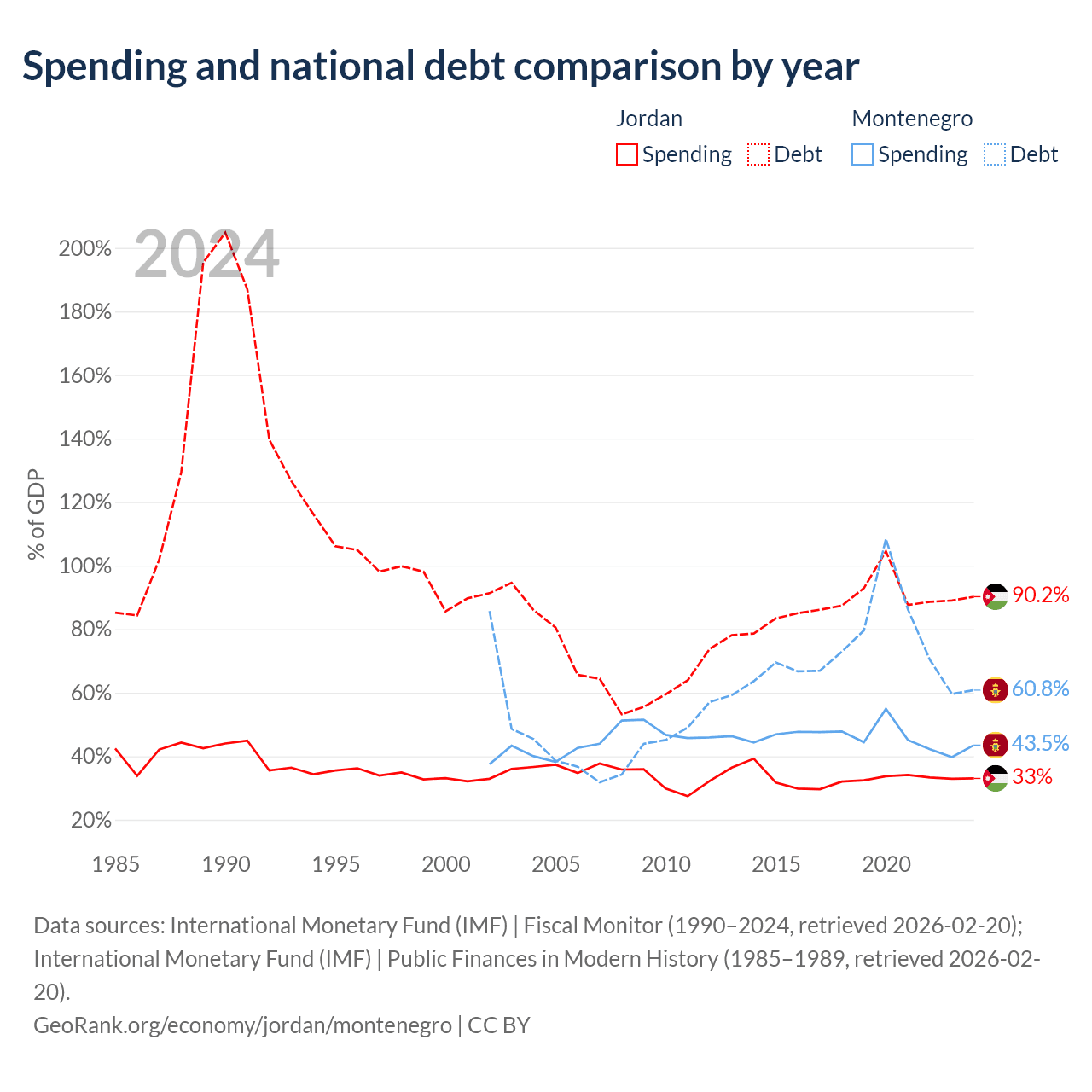 Jordan has $48.1B in government debt (90.2% of GDP), compared to $5.02B (60.8% of GDP) in Montenegro.