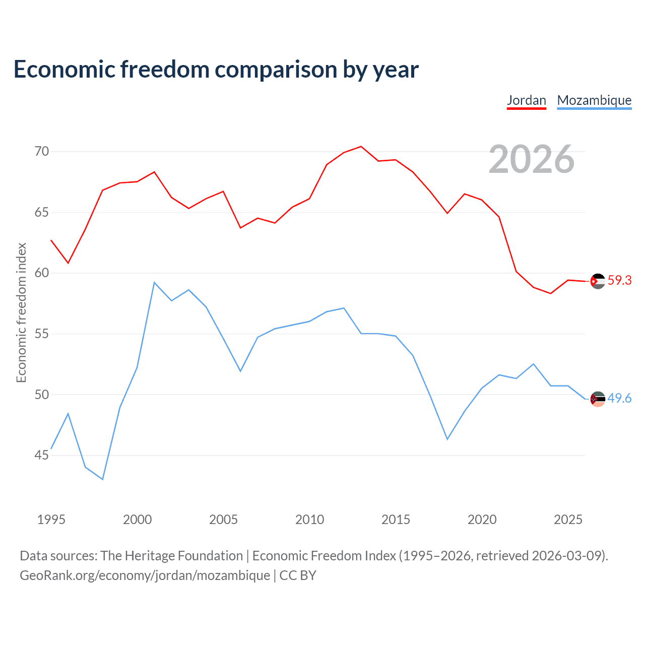 The Economic Freedom Index for Jordan is 59.3, ranking 104/197, compared to 49.6 for Mozambique, ranking 164/197. The chart above displays a comparison of annual changes in economic freedom indexes.