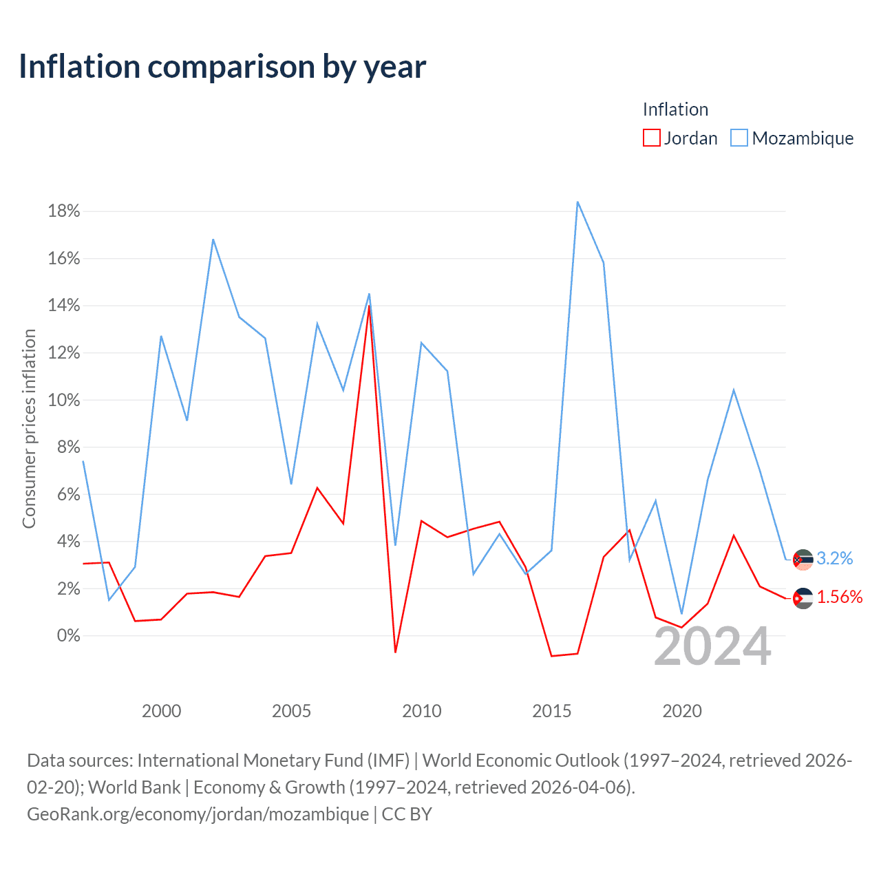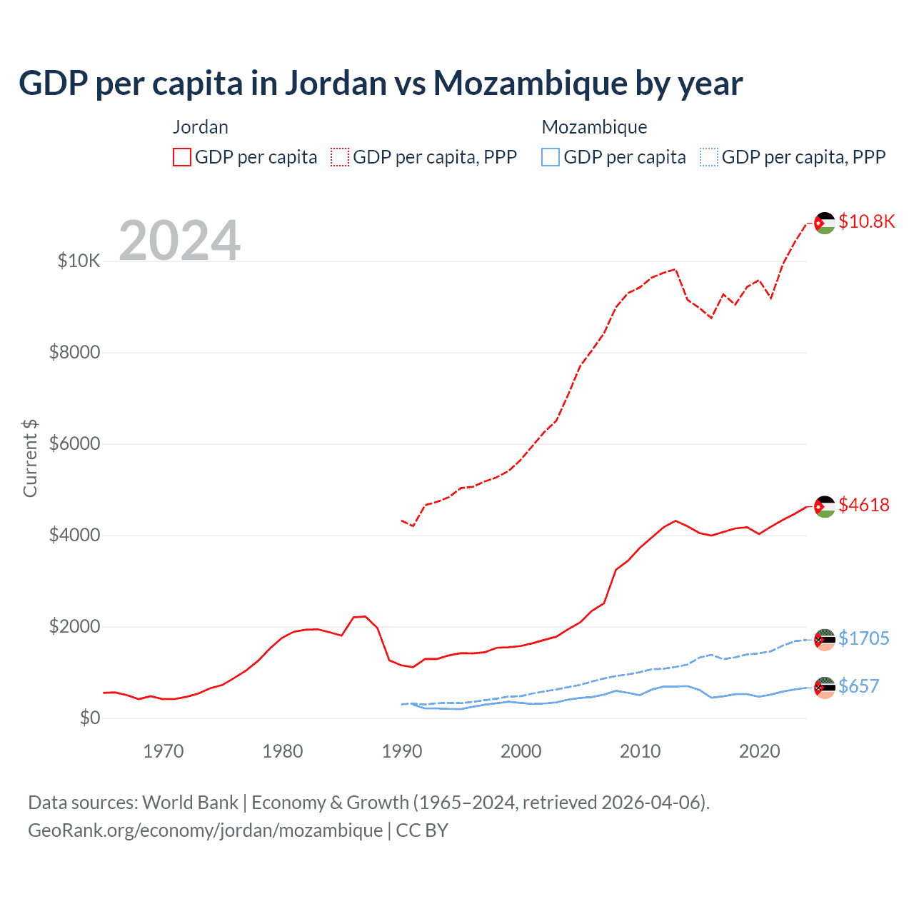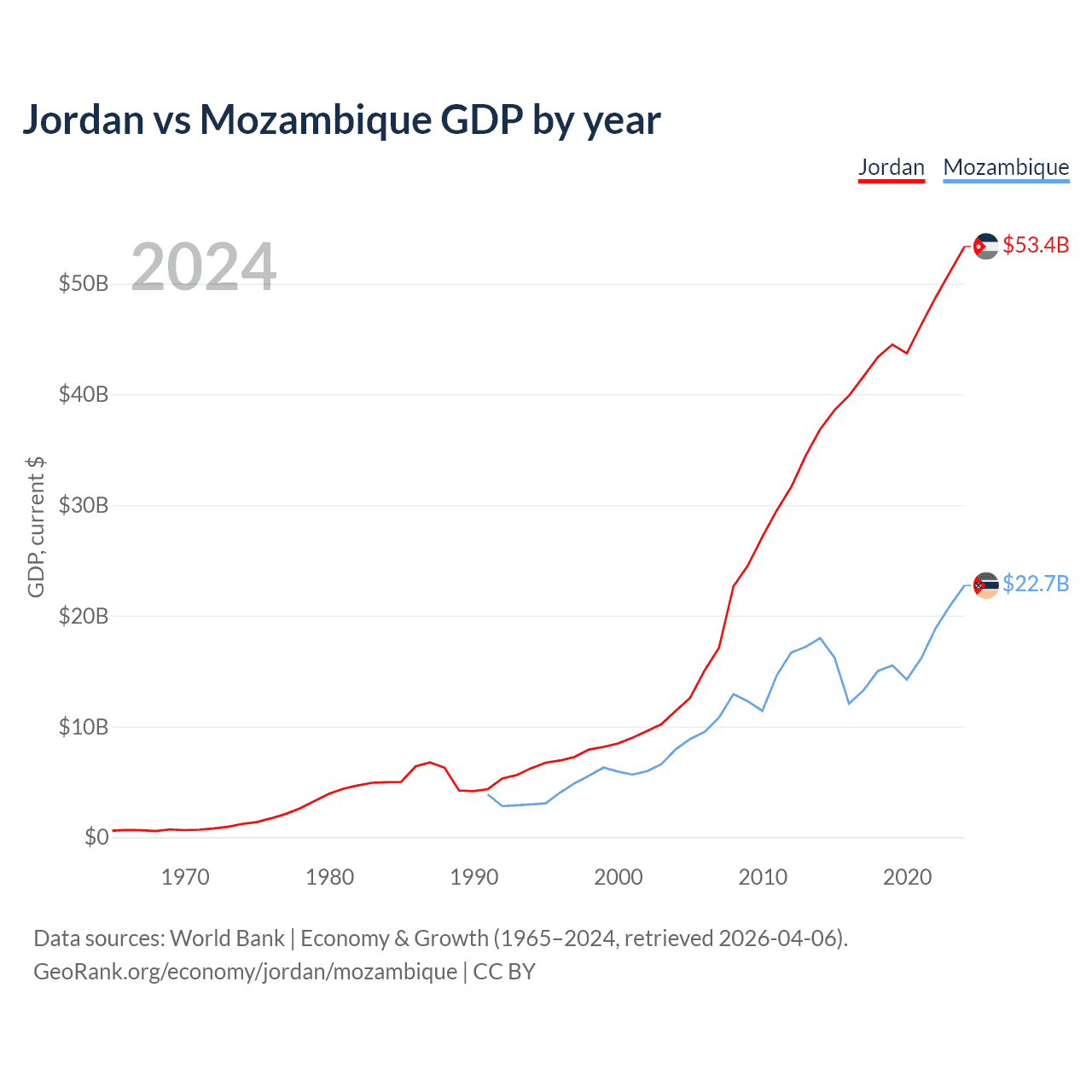 Jordan has a GDP of $53.4B compared to $22.7B for Mozambique, ranking 90/197 and 123/197 by economy size, respectively.