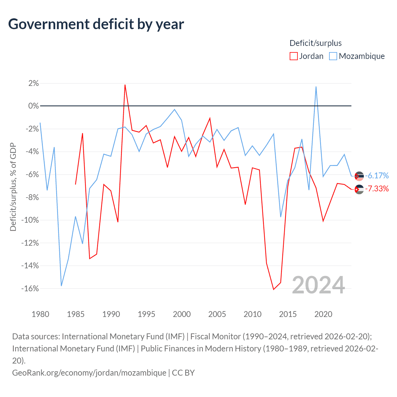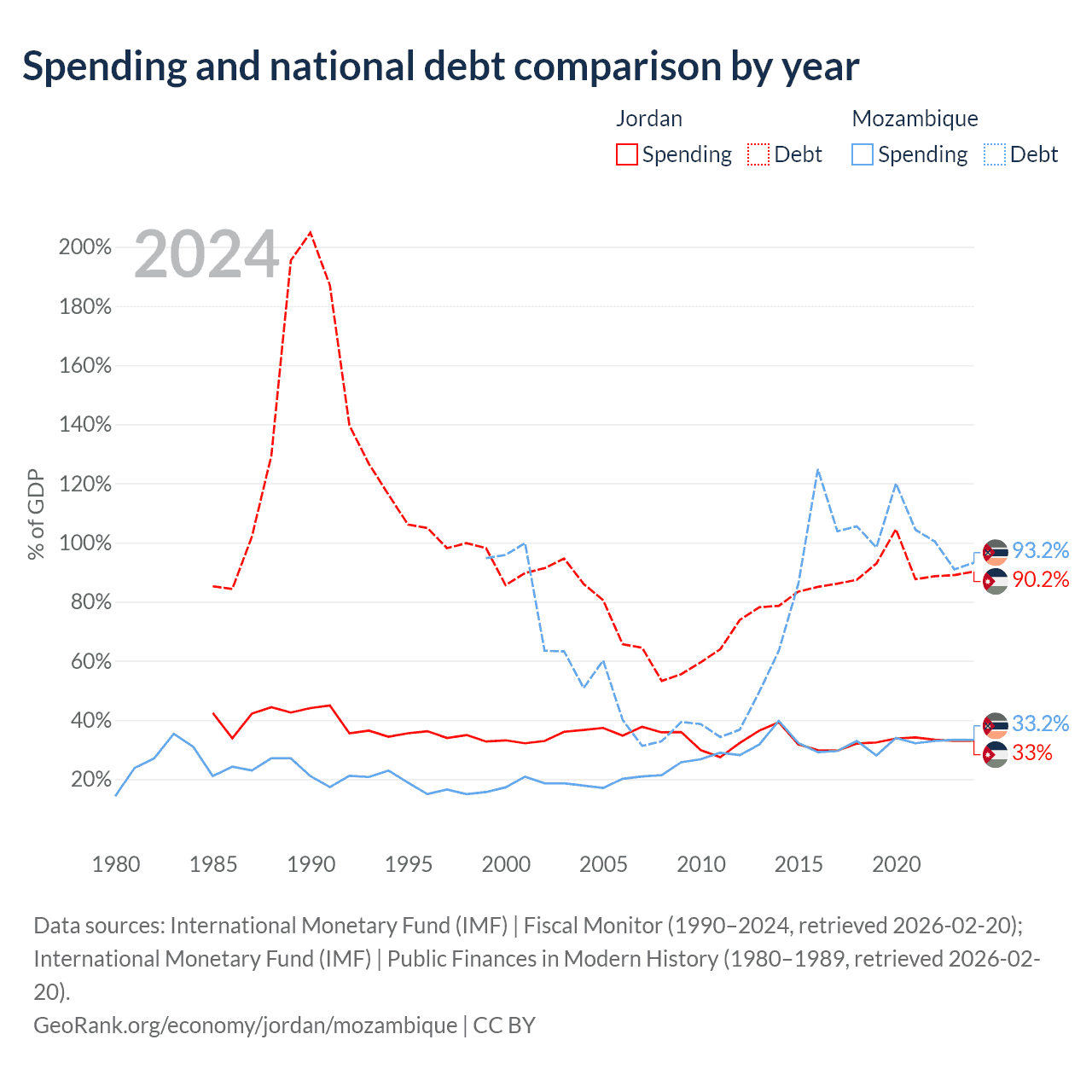 Jordan has $48.1B in government debt (90.2% of GDP), compared to $21.2B (93.2% of GDP) in Mozambique.