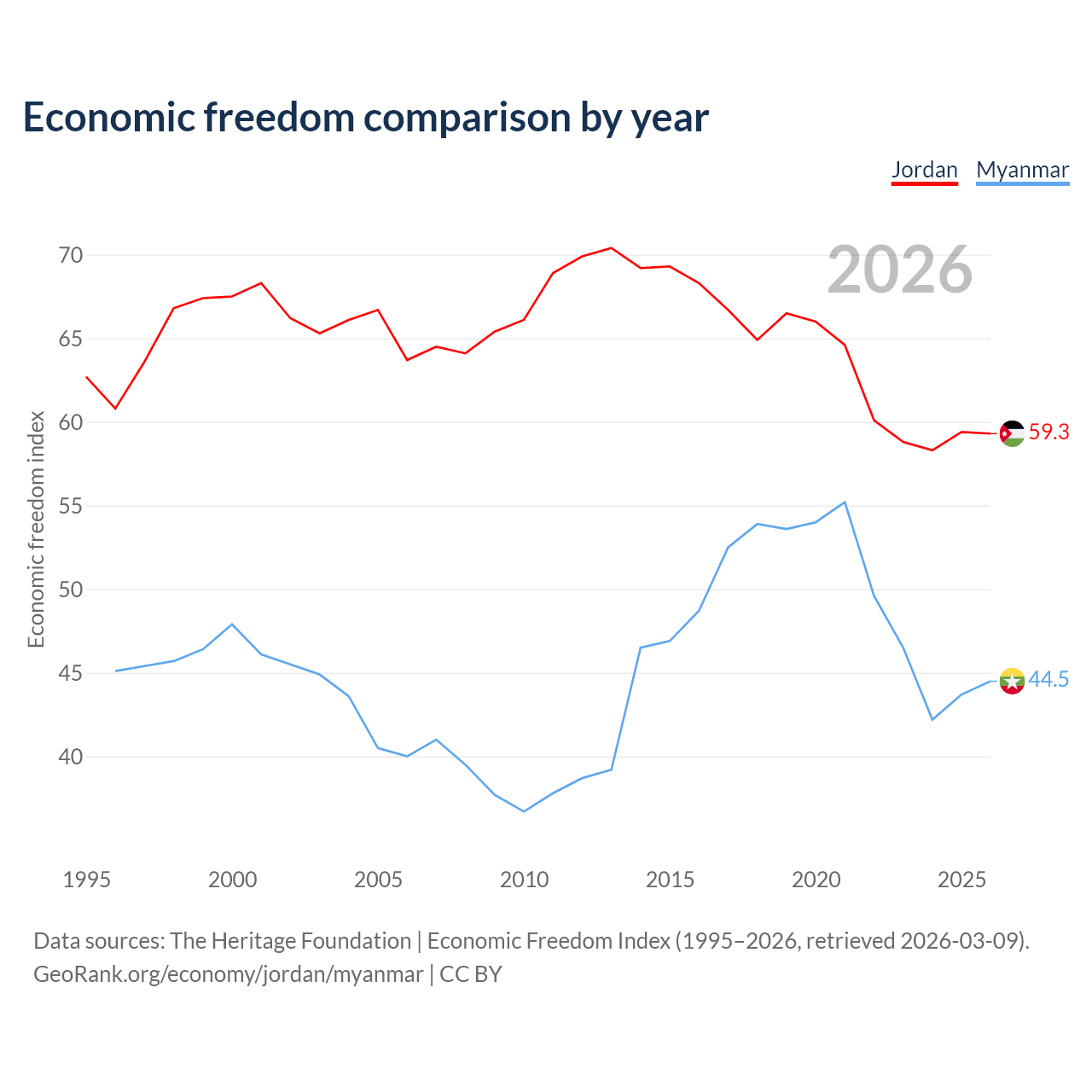 The Economic Freedom Index for Jordan is 59.3, ranking 104/197, compared to 44.5 for Myanmar, ranking 180/197. The chart above displays a comparison of annual changes in economic freedom indexes.
