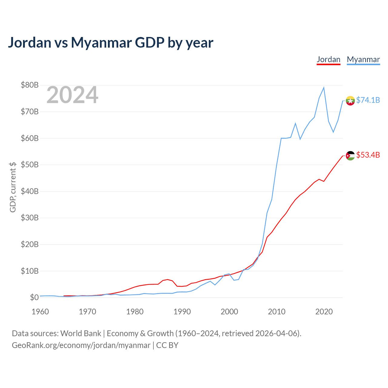 Jordan has a GDP of $53.4B compared to $74.1B for Myanmar, ranking 90/197 and 85/197 by economy size, respectively.