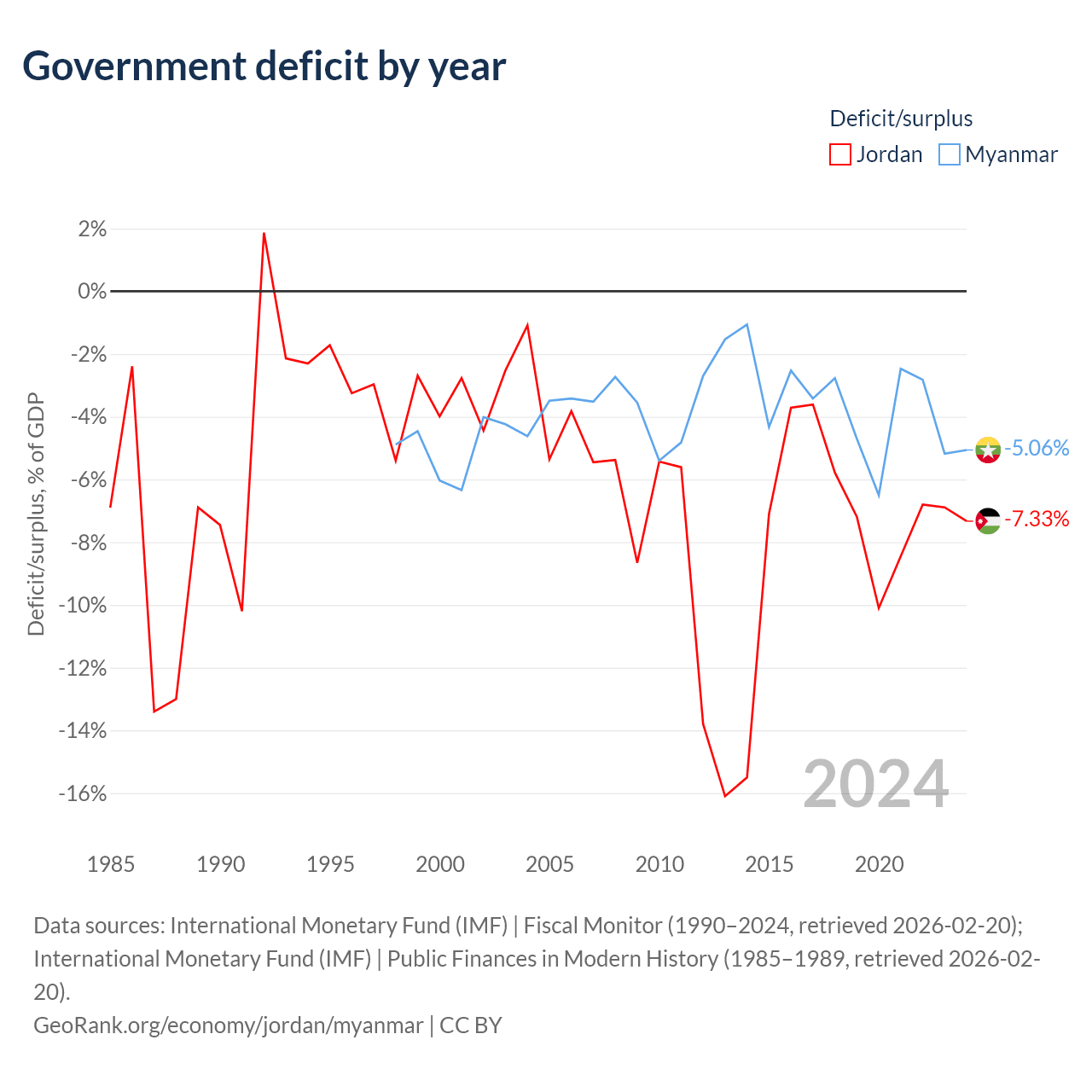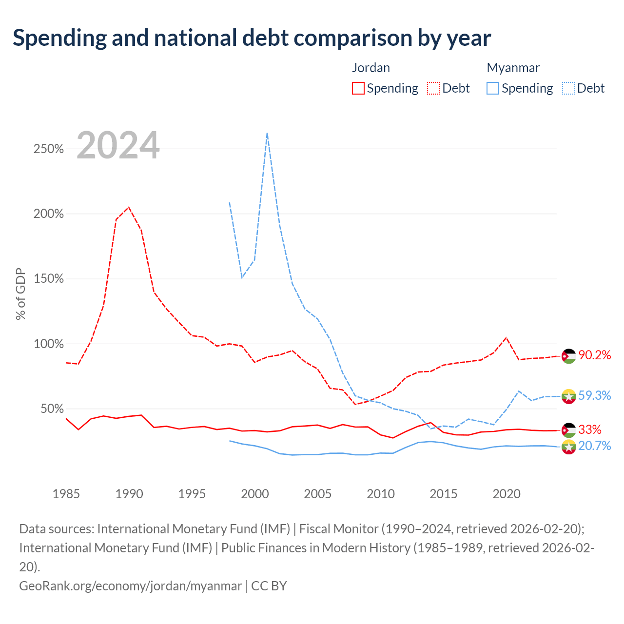 Jordan has $48.1B in government debt (90.2% of GDP), compared to $44B (59.3% of GDP) in Myanmar.