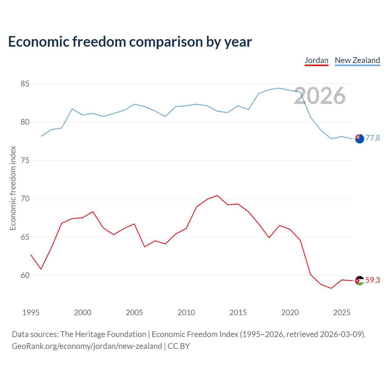 The Economic Freedom Index for Jordan is 59.3, ranking 104/197, compared to 77.8 for New Zealand, ranking 13/197. The chart above displays a comparison of annual changes in economic freedom indexes.