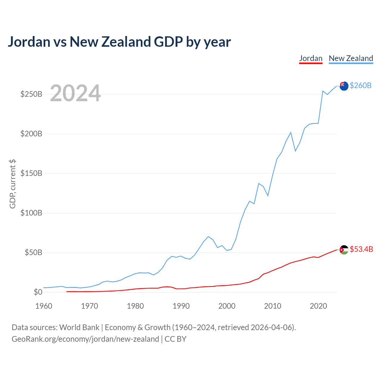 Jordan has a GDP of $53.4B compared to $260B for New Zealand, ranking 90/197 and 52/197 by economy size, respectively.