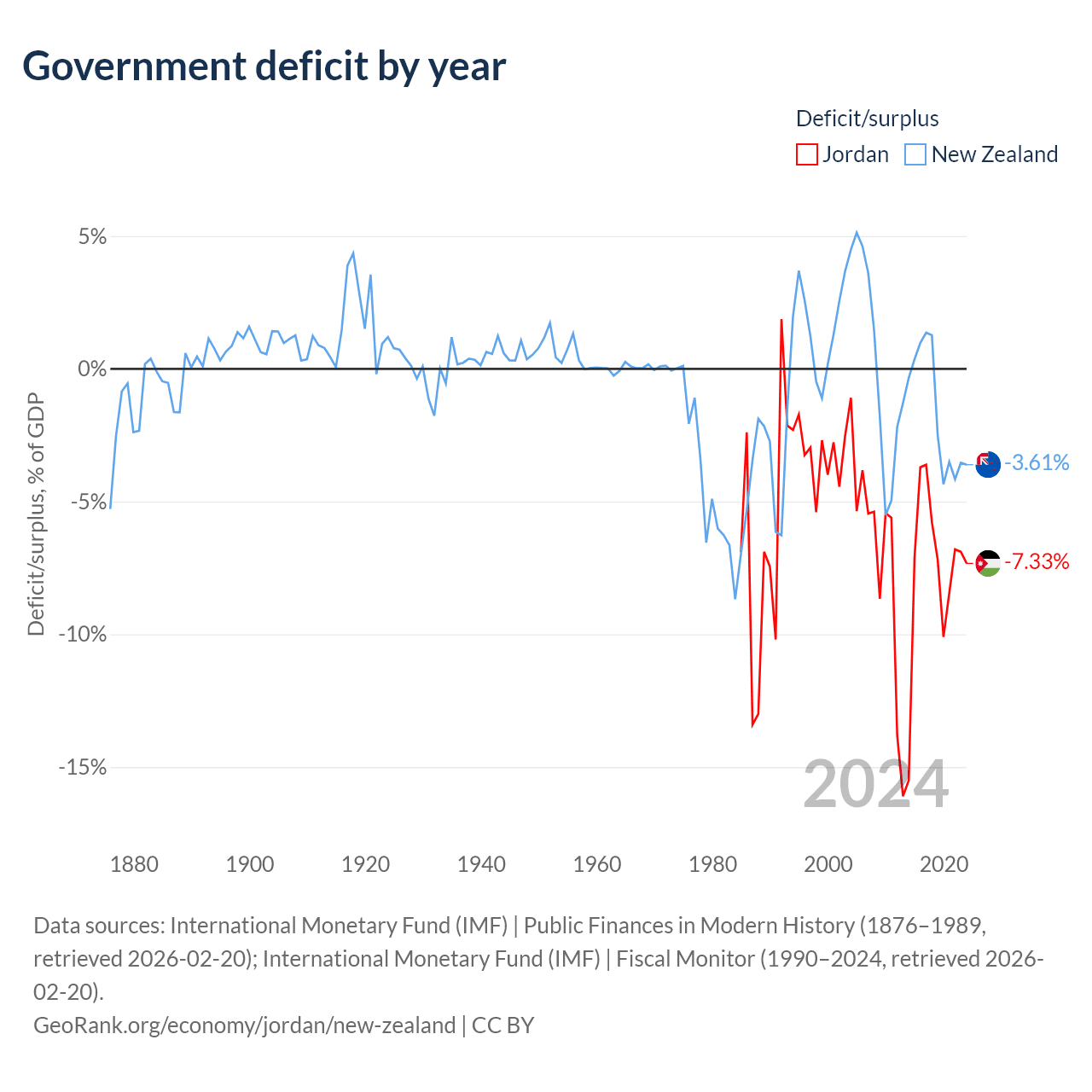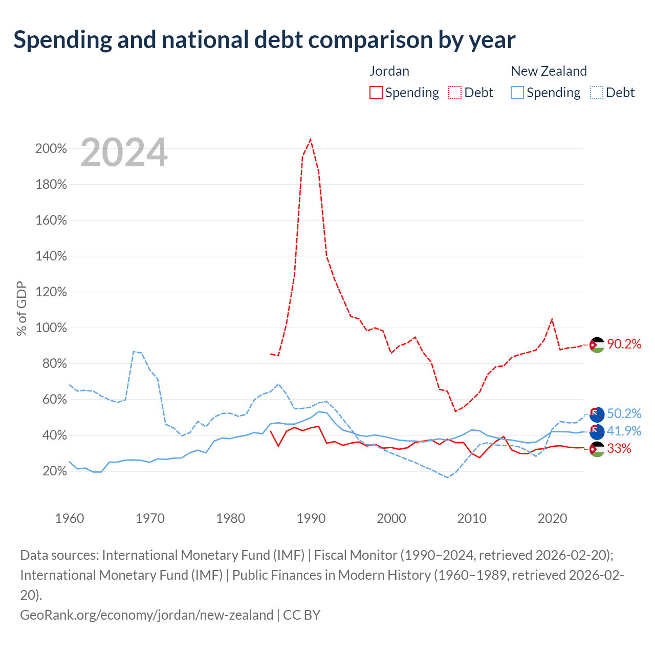 Jordan has $48.1B in government debt (90.2% of GDP), compared to $131B (50.2% of GDP) in New Zealand.