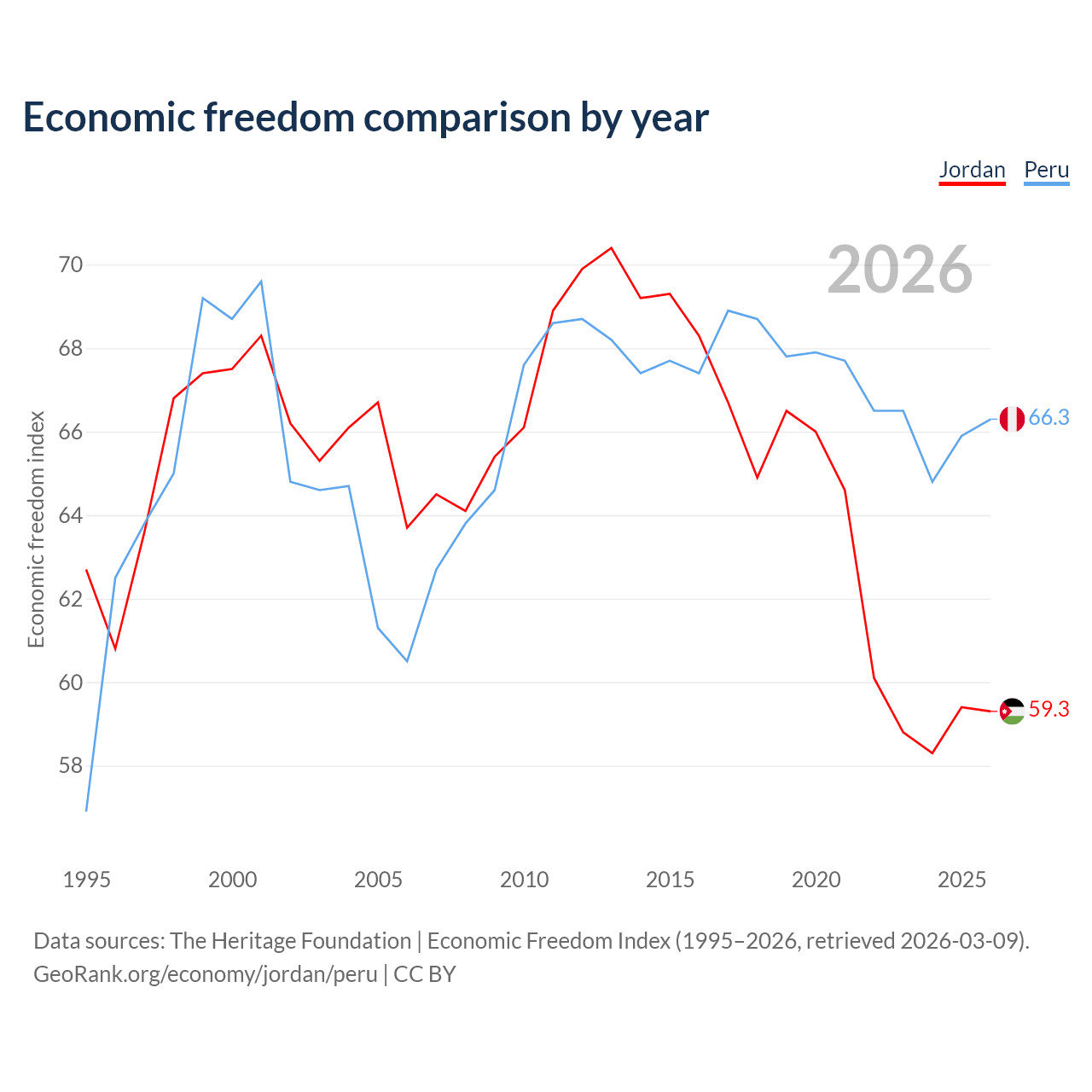 The Economic Freedom Index for Jordan is 59.3, ranking 104/197, compared to 66.3 for Peru, ranking 62/197. The chart above displays a comparison of annual changes in economic freedom indexes.