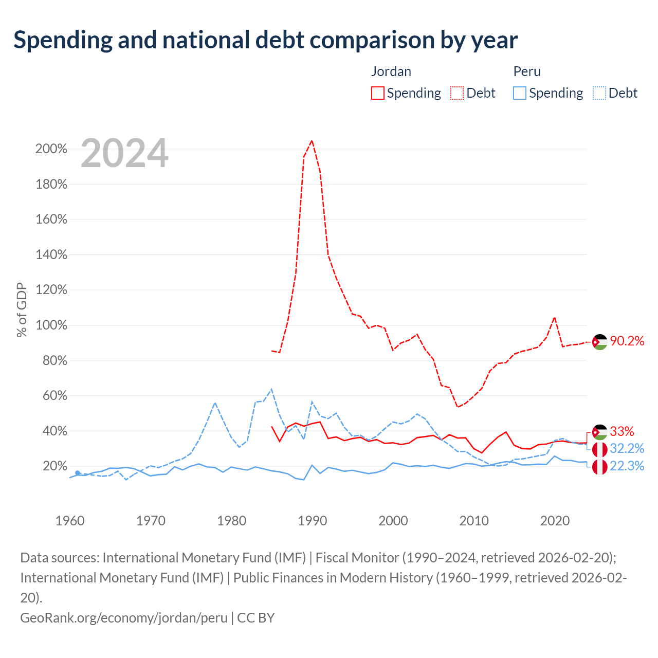 Jordan has $48.1B in government debt (90.2% of GDP), compared to $93B (32.2% of GDP) in Peru.