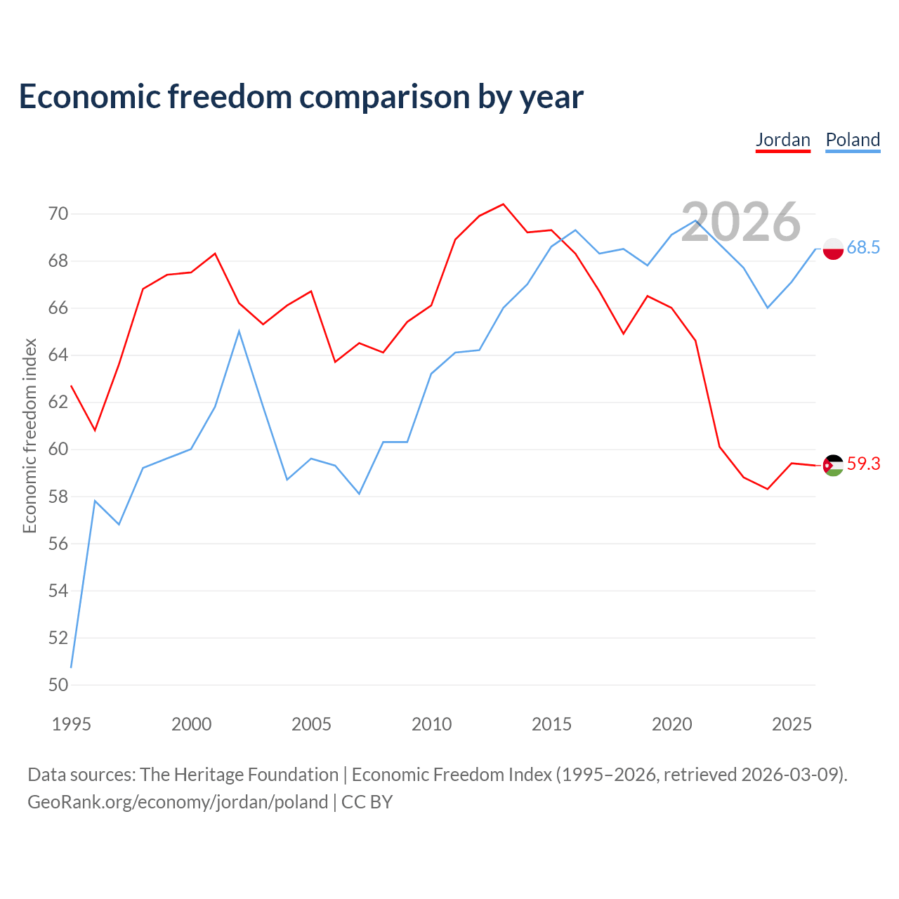 The Economic Freedom Index for Jordan is 59.3, ranking 104/197, compared to 68.5 for Poland, ranking 46/197. The chart above displays a comparison of annual changes in economic freedom indexes.