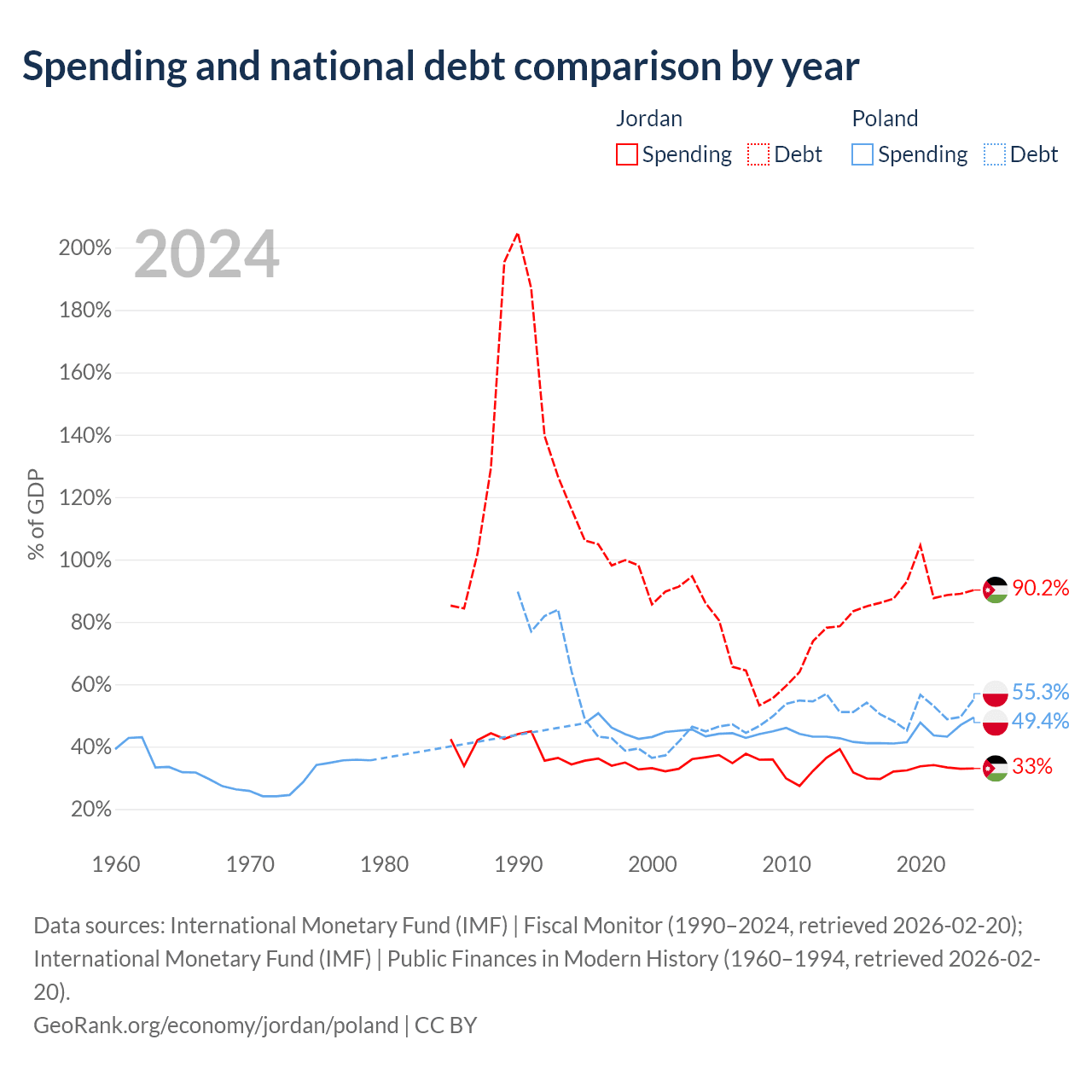 Jordan has $48.1B in government debt (90.2% of GDP), compared to $507B (55.3% of GDP) in Poland.